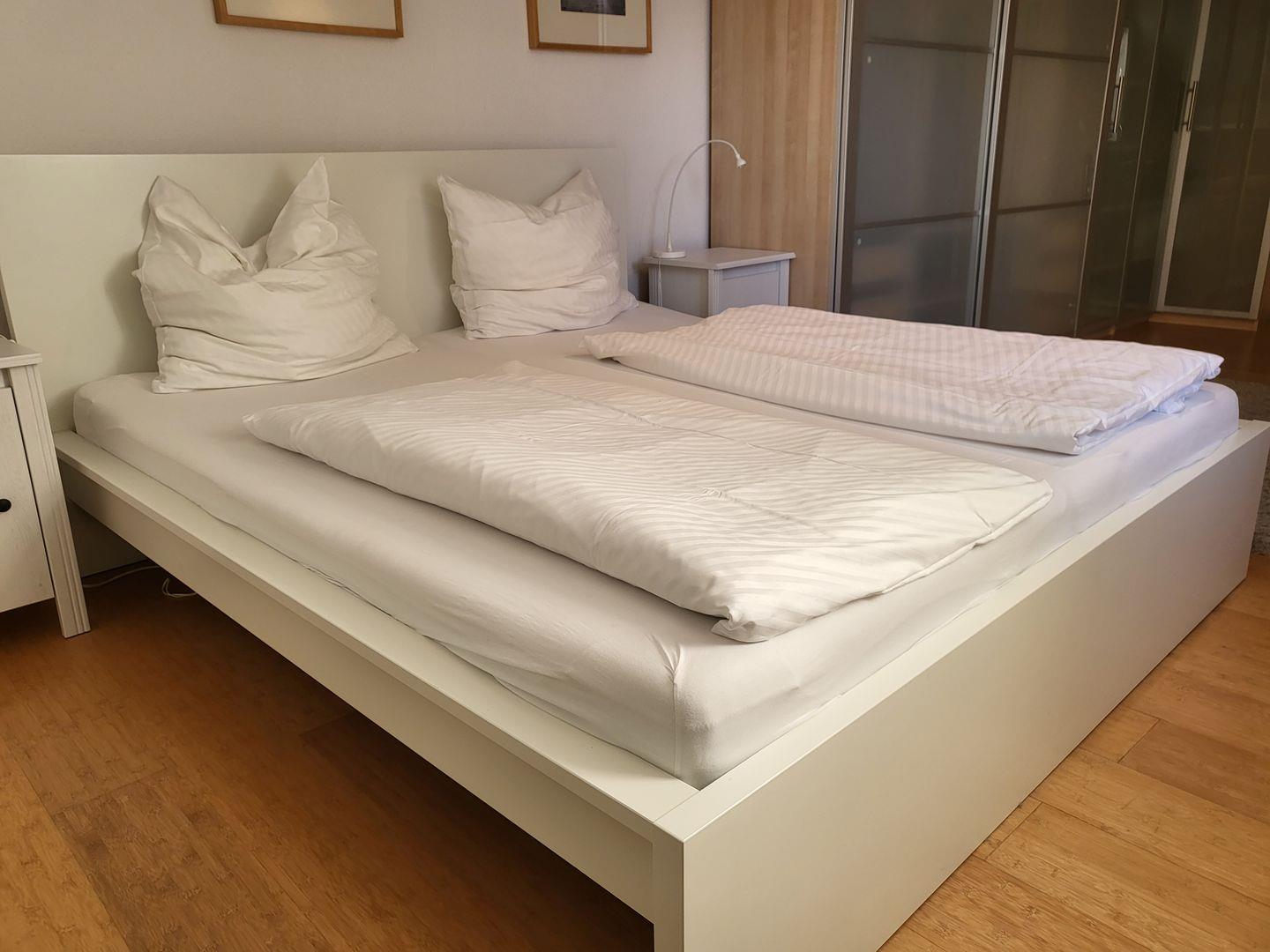 Angrenzend an den in den Raum integrierten Essbereich befindet sich ein Doppelbett mit 140x200cm Liegefläche. Das separate Schlafzimmer ist ausgestattet mit Doppelbett und geräumigem Kleiderschrank.