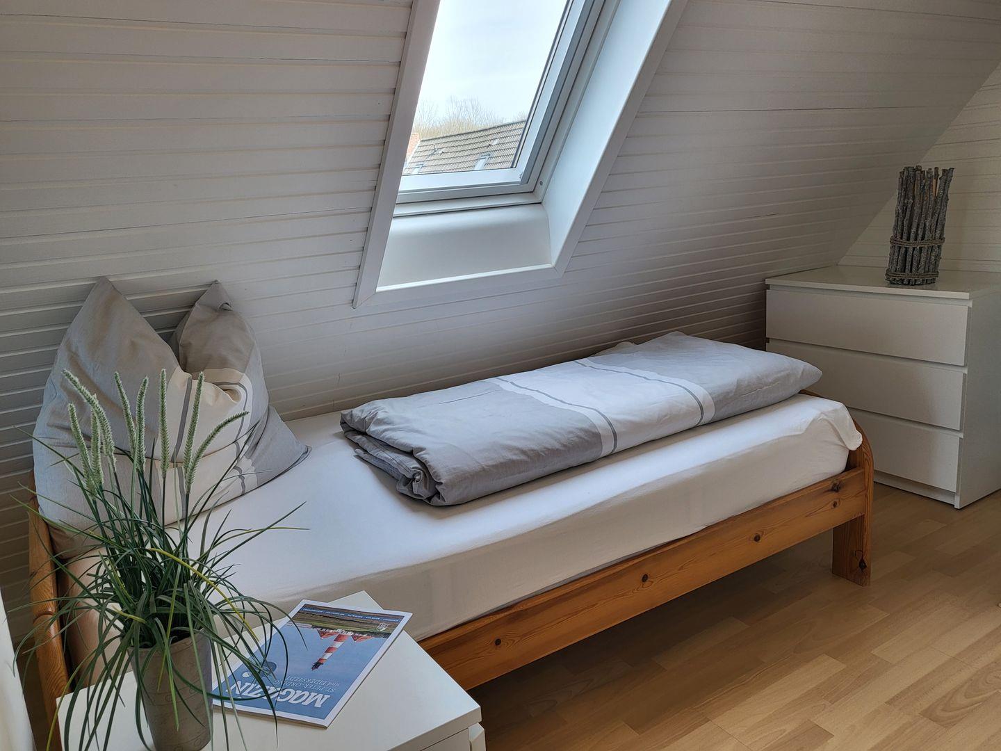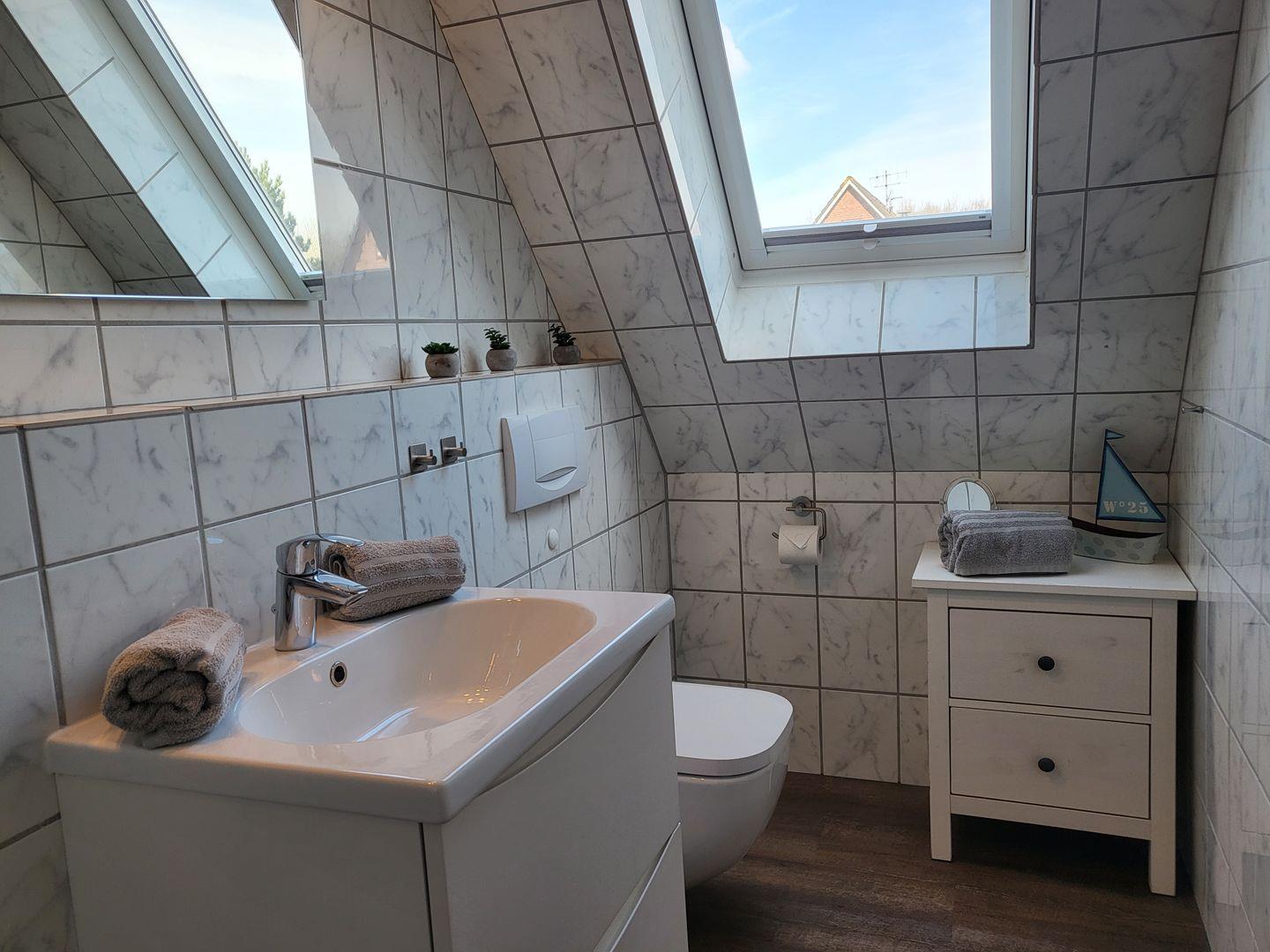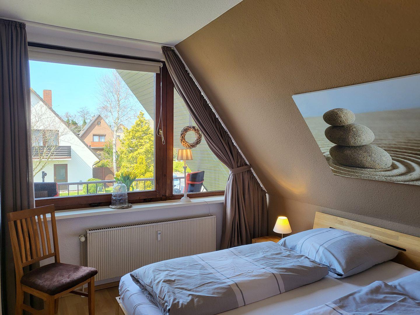 Zum Eingang der Wohnung gelangen Sie über das Treppenhaus im OG. Vom Flur mit Garderobe aus gelangen Sie in die separate Küche, ins Duschbad mit WC und in den gemütlichen Wohnraum. Hier haben sie einen Esstisch mit 4 Plätzen und eine gemütliche Couch, ein großer Flachbild-TV und WLAN stehen zur Verfügung. Auf dem Balkon hinter der Fensterfront ist genügend Platz für Tisch und Stühle um die Nachmittag- und Abendsonne zu genießen. Vom Wohnraum aus geht es in das Schlafzimmer mit Doppelbett und geräumigen Kleiderschrank. Über die Treppe (sie ist etwas steil) ins Dachgeschoss. Hier ist das zweite Schlafzimmer mit zwei Einzelbetten untergebracht. Das große Giebelfenster gibt schönes Tageslicht und einen hervorragenden Ausblick. Davor steht seitlich zur rechten Wand ein Schreibtisch und auf der linken Seite ein Sofa. Insgesamt zeigt sich diese Wohnung sehr hell und freundlich und ist mit viel Liebe zum Detail ausgestattet. Die Wohnung dient 2-4 Personen eine komfortable Ferienunterkunft in ruhiger Lage mit kurzen Wegen über grüne Wege ins Kurzentrum Bad sowie Dorfzentrum. Über die Kur- und Erlebnispromenade gelangen Sie zur Seebrücke an den längsten Natursandstrand der Nordseeküste.