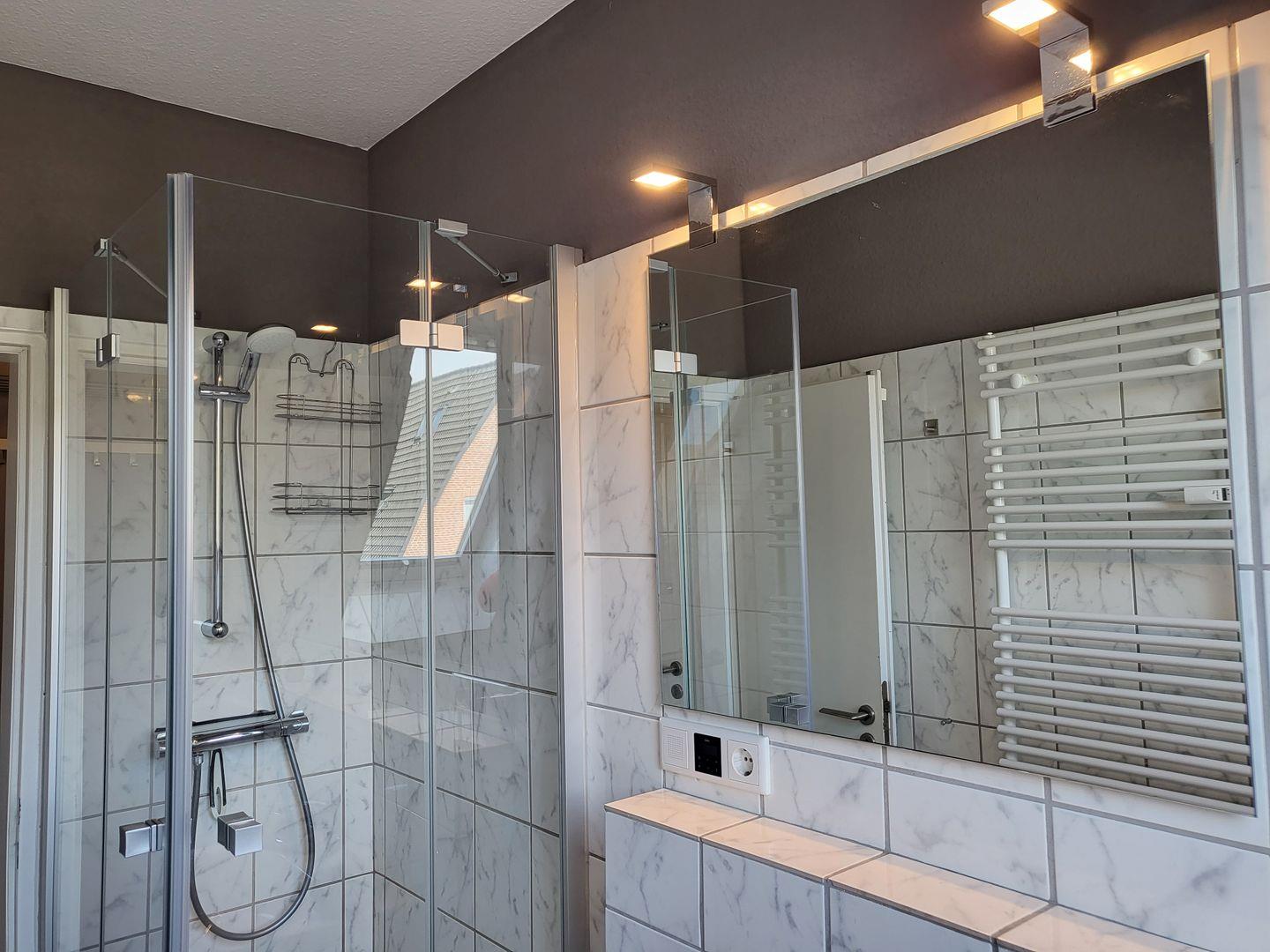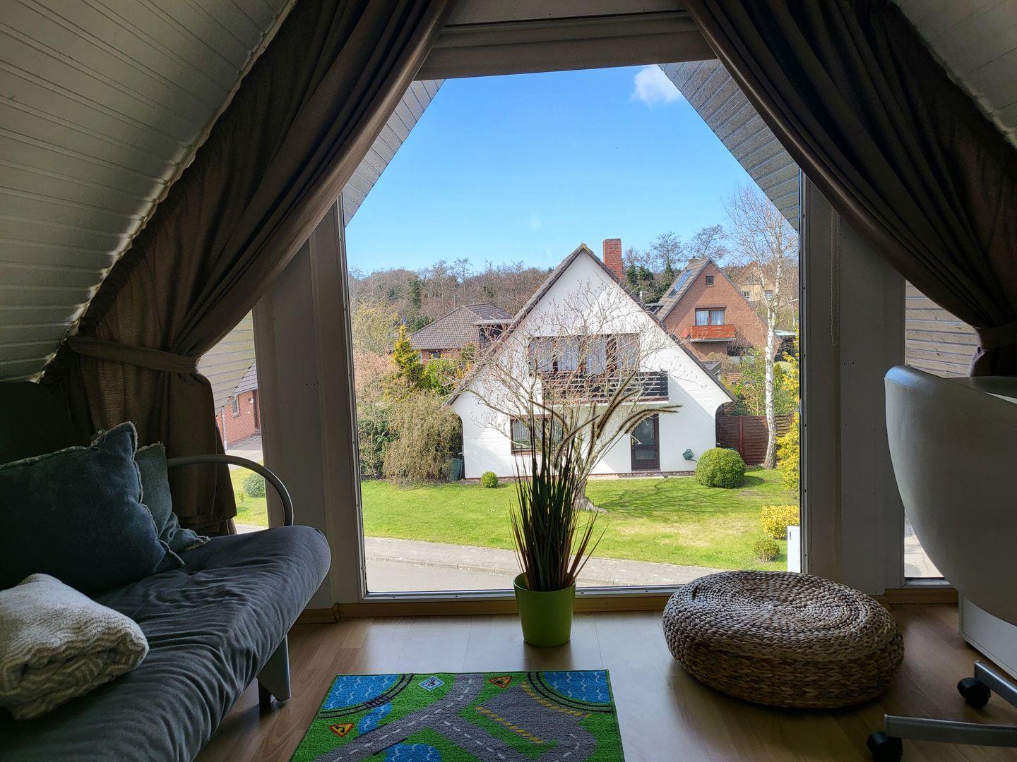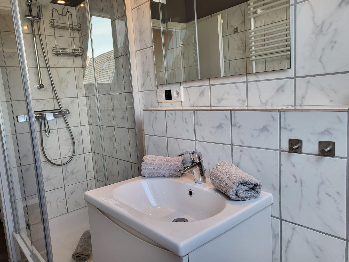 Zum Eingang der Wohnung gelangen Sie über das Treppenhaus im OG. Vom Flur mit Garderobe aus gelangen Sie in die separate Küche, ins Duschbad mit WC und in den gemütlichen Wohnraum. Hier haben sie einen Esstisch mit 4 Plätzen und eine gemütliche Couch, ein großer Flachbild-TV und WLAN stehen zur Verfügung. Auf dem Balkon hinter der Fensterfront ist genügend Platz für Tisch und Stühle um die Nachmittag- und Abendsonne zu genießen. Vom Wohnraum aus geht es in das Schlafzimmer mit Doppelbett und geräumigen Kleiderschrank. Über die Treppe (sie ist etwas steil) ins Dachgeschoss. Hier ist das zweite Schlafzimmer mit zwei Einzelbetten untergebracht. Das große Giebelfenster gibt schönes Tageslicht und einen hervorragenden Ausblick. Davor steht seitlich zur rechten Wand ein Schreibtisch und auf der linken Seite ein Sofa. Insgesamt zeigt sich diese Wohnung sehr hell und freundlich und ist mit viel Liebe zum Detail ausgestattet. Die Wohnung dient 2-4 Personen eine komfortable Ferienunterkunft in ruhiger Lage mit kurzen Wegen über grüne Wege ins Kurzentrum Bad sowie Dorfzentrum. Über die Kur- und Erlebnispromenade gelangen Sie zur Seebrücke an den längsten Natursandstrand der Nordseeküste.
