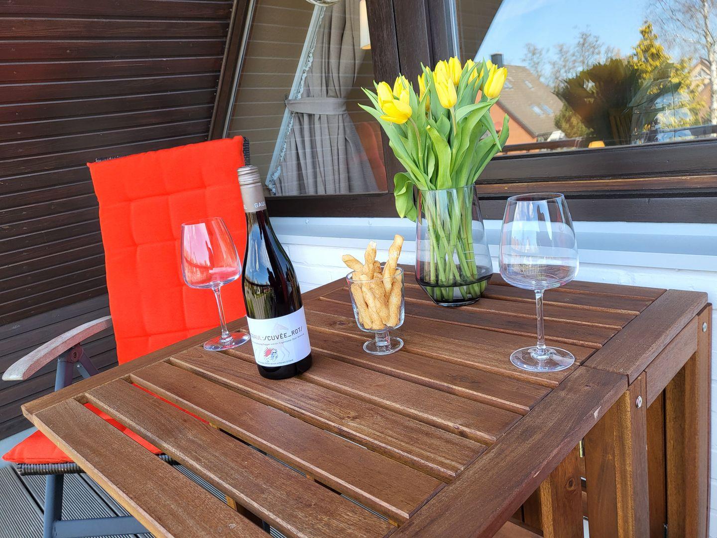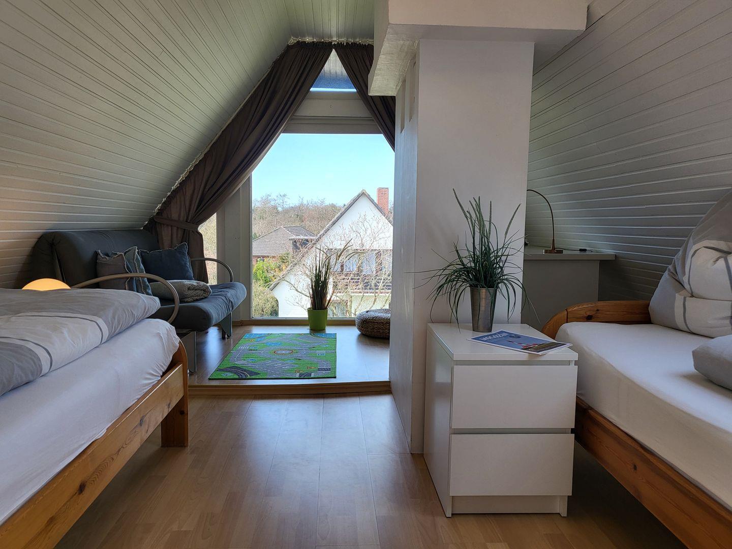 Moderne 3 Zimmer-Wohnung mit Balkon im OG für bis zu 4 Personen ohne Haustiere. Wohnraum mit Esstisch und Sofa, gr. TV, 1 Schlafzimmer mit Doppelbett, Duschbad mit WC, separate Küche, Flur, Dachgeschoss mit Schlafzimmer und 2 Einzelbetten.