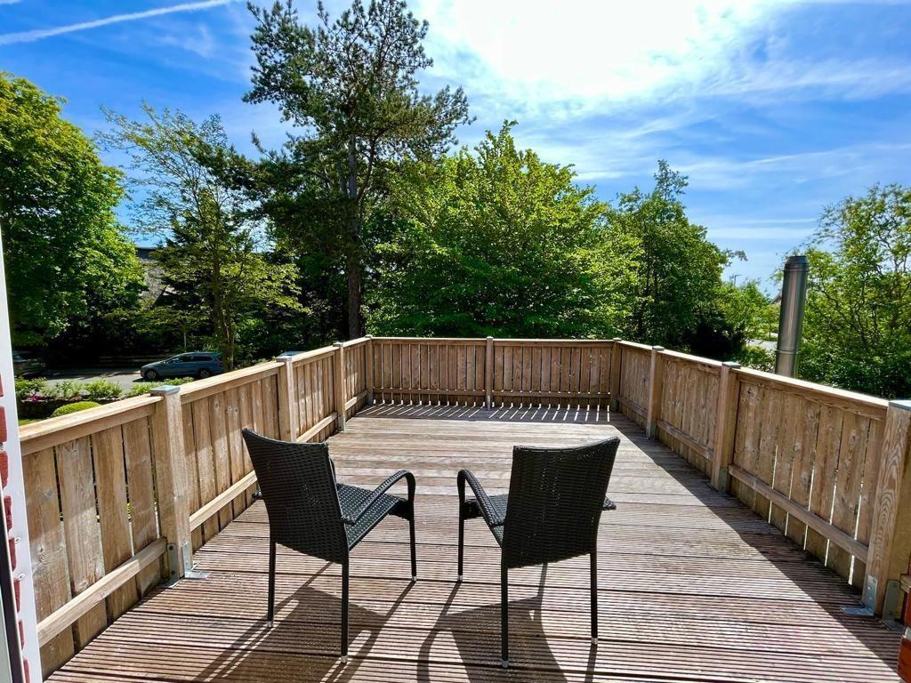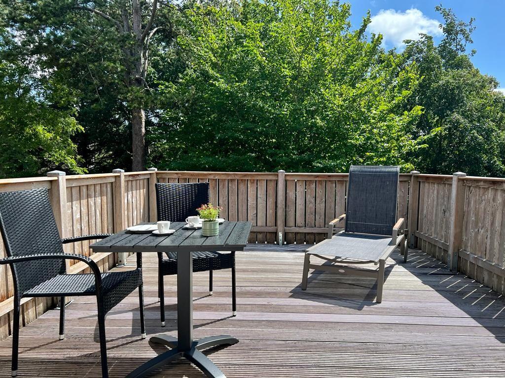Der Balkon mit Gartenmöbeln lädt zum Frühstücken ein.