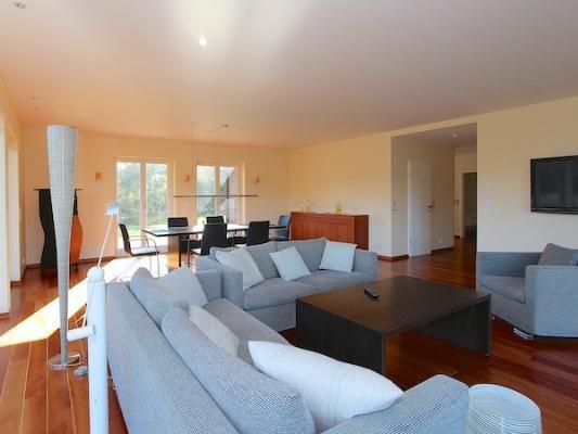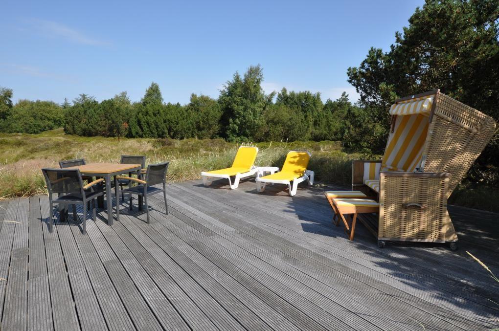 Die Küche der Firma "Leicht" ist mit erstklassigen Elektrogeräten ausgestattet, auf der Terrasse stehen Gartenmöbel und ein Strandkorb bereit.