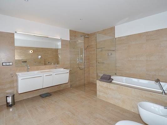 Obergeschoss: eigener Eingangsbereich, Wohnraum mit offener Küche, Essbereich und Zugang zu insgesamt 3 Balkonen, ein Schlafzimmer mit Doppelbett (200 x 200 cm), Ankleideraum, zweiseitig umlaufendem Balkon und angegliedertem Duschbad / WC mit ebenerdiger Dusche und Bidet