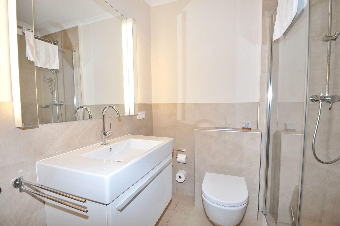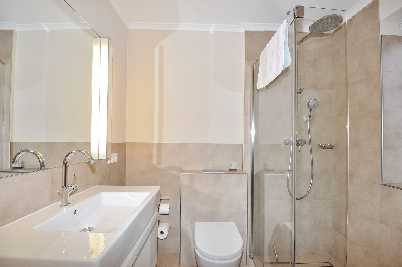Obergeschoss: 1 Schlafzimmer mit Doppelbett (je 180 x 200 cm - Einzelmatratzen), 1 Schlafzimmer mit 2 Einzelbetten (je 90 x 200 cm), ein Wannenbad / WC mit separater Dusche und Handtuchheizung, ein kleiner Arbeitsraum