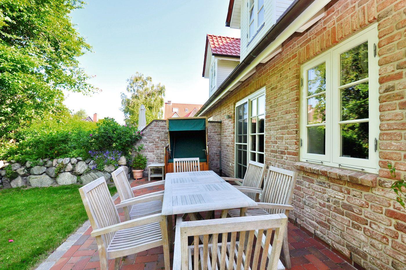 Die Terrasse in Westausrichtung ist mit Gartenmöbeln und einem Strandkorb ausgestattet.