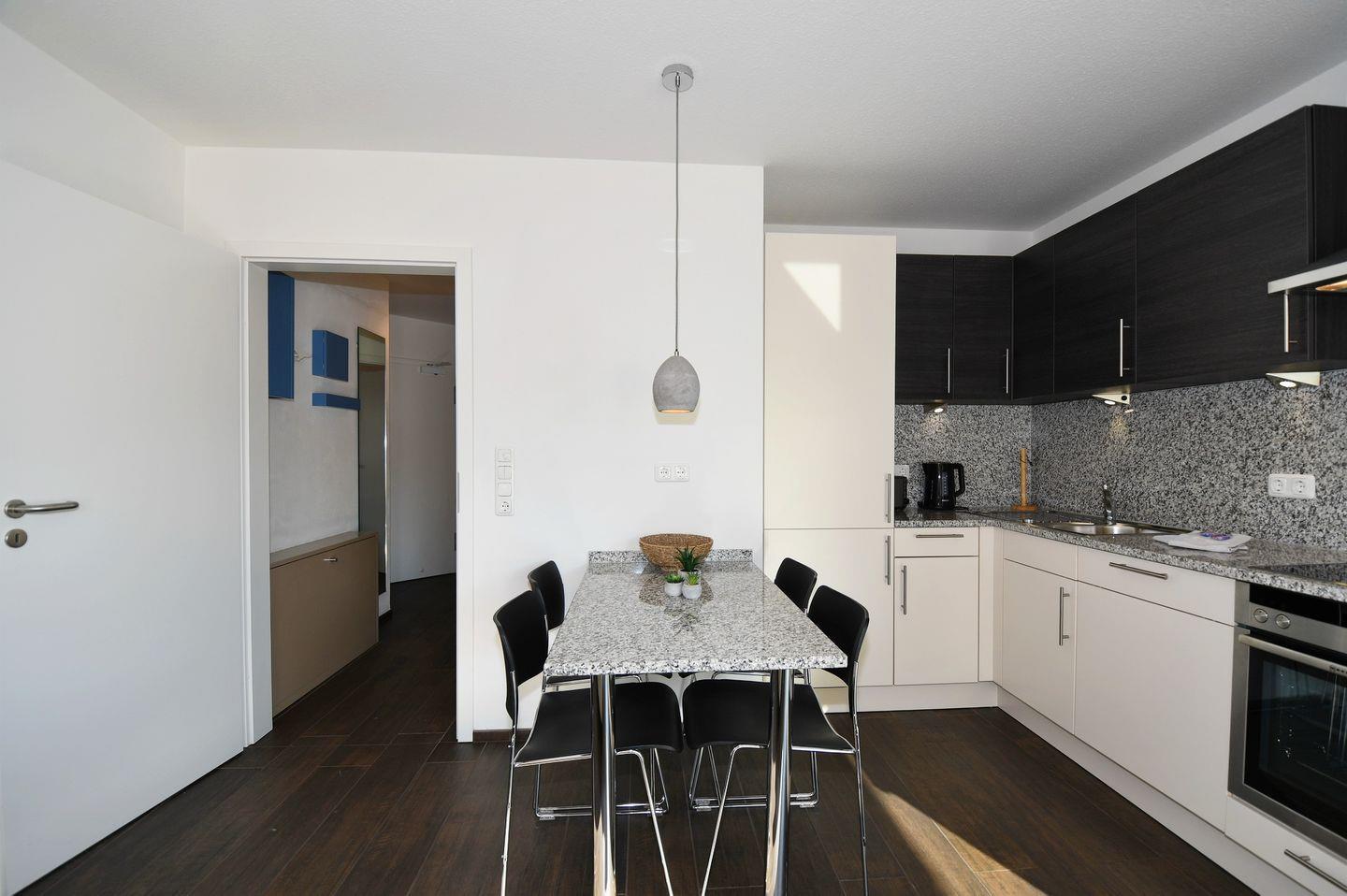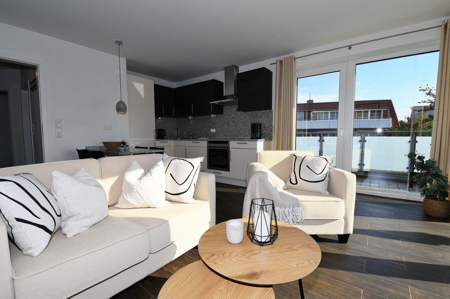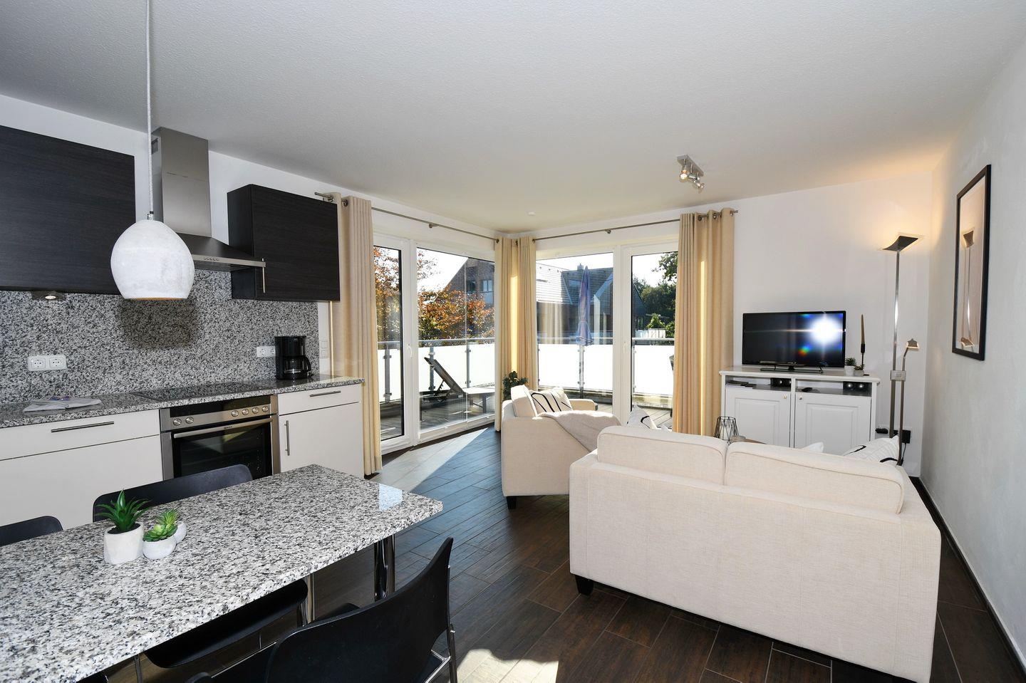 Eingangsbereich mit Garderobe, ein Schlafzimmer mit Doppelbett (180 x 200 cm), Wohnraum mit integrierter Einbauküche, Essbereich und Zugang zum Eck-Balkon, ein Duschbad / WC