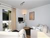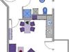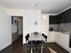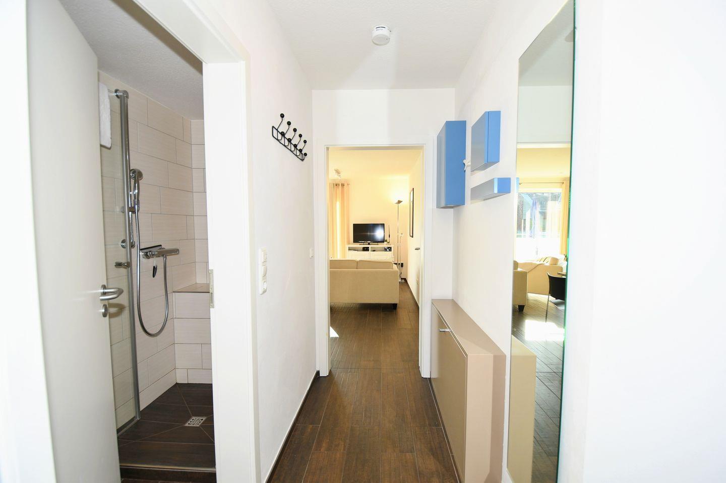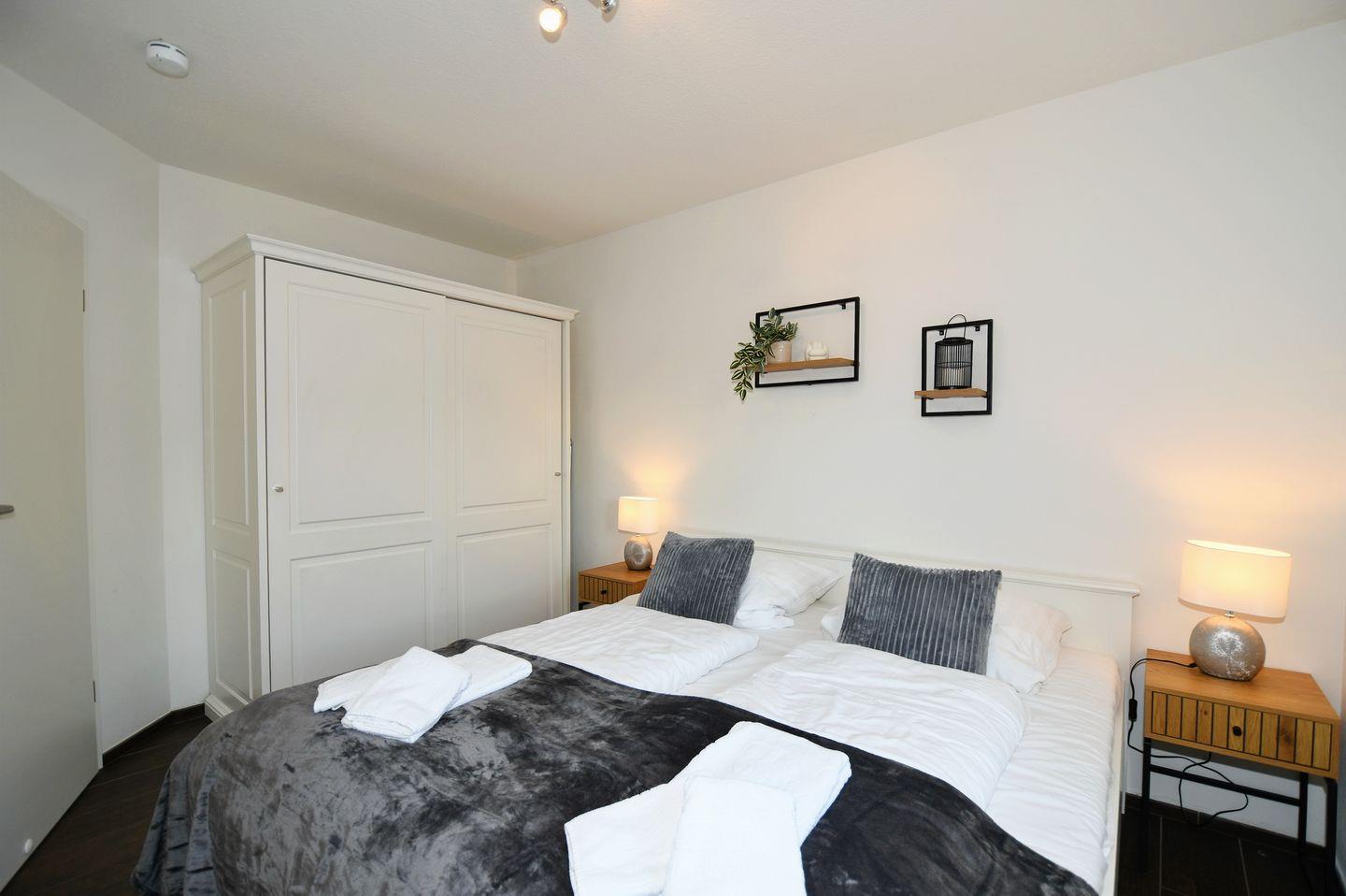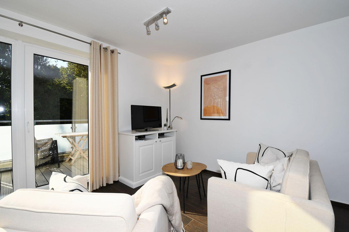 Eingangsbereich mit Garderobe, ein Schlafzimmer mit Doppelbett (180 x 200 cm), Wohnraum mit integrierter Einbauküche, Essbereich und Zugang zum Eck-Balkon, ein Duschbad / WC