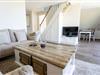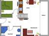 Obergeschoss: Eingangsbereich, ein Schlafzimmer mit Doppelbett (180 x 200 cm - Einzelmatratzen), Wohnraum mit integrierter Küche, Essbereich und Zugang zum Balkon, ein Duschbad / WC