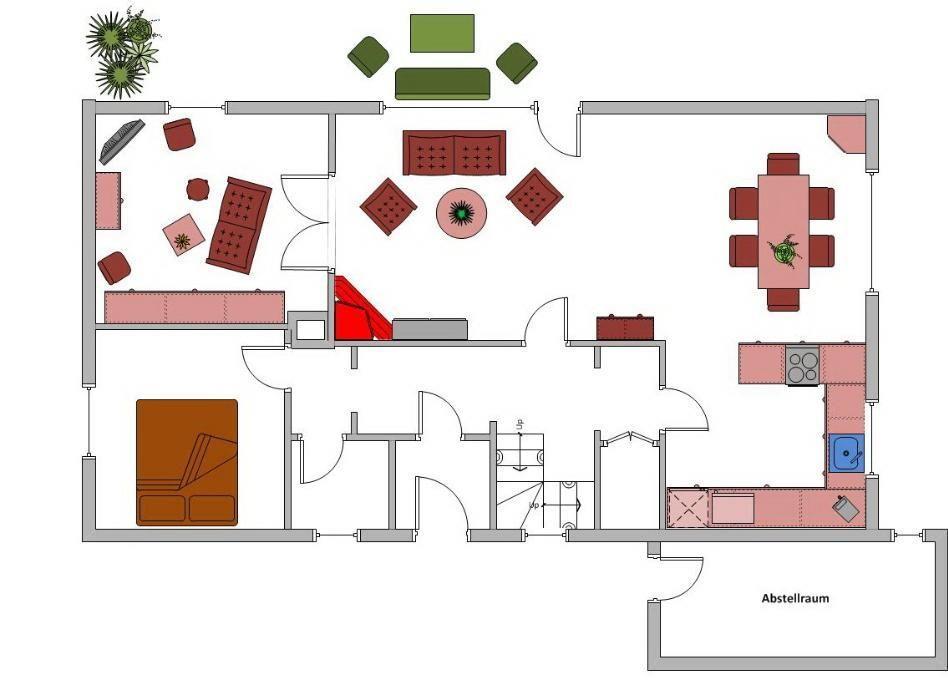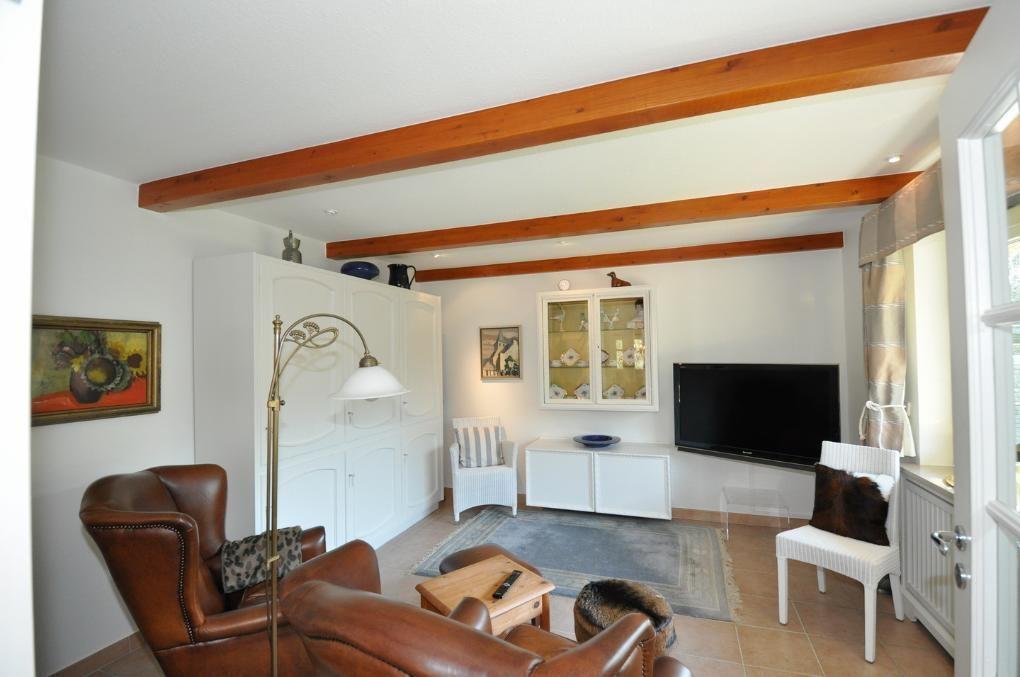 Erdgeschoss: Eingangsbereich, Wohnraum mit offener Küche, Essbereich, Kamin und Zugang zur Terrasse (Süd-Westausrichtung), ein separates TV-Zimmer, ein Doppelschlafzimmer mit Boxspringbett (160 x 200 cm - durchgehender Topper), ein Duschbad / WC