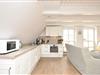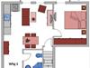 Obergeschoss: Eingangsbereich, Wohnraum mit integrierter Küche, Essbereich und Zugang zum Balkon, ein Schlafzimmer mit Doppelbett (180 x 200 cm), ein Duschbad / WC