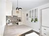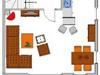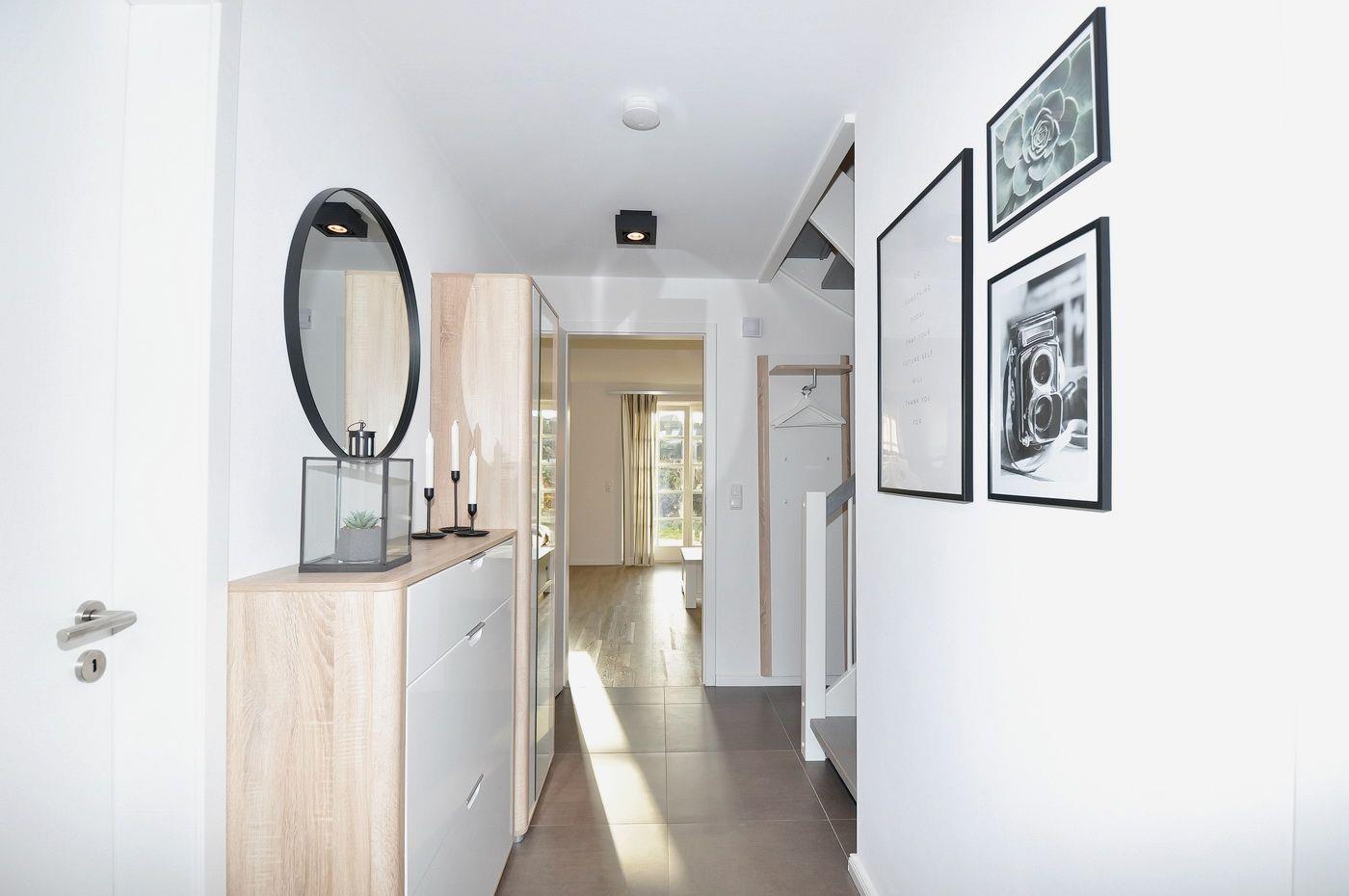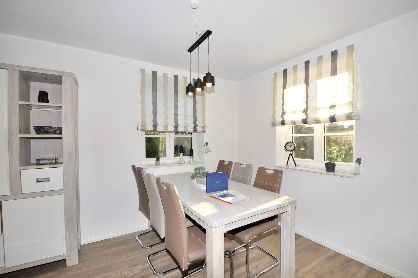 Erdgeschoss: Eingangsbereich, Wohnraum mit offener Küche, Essbereich, Kamin und Zugang zur Terrasse, ein Duschbad / WC, ein Hauswirtschaftsraum