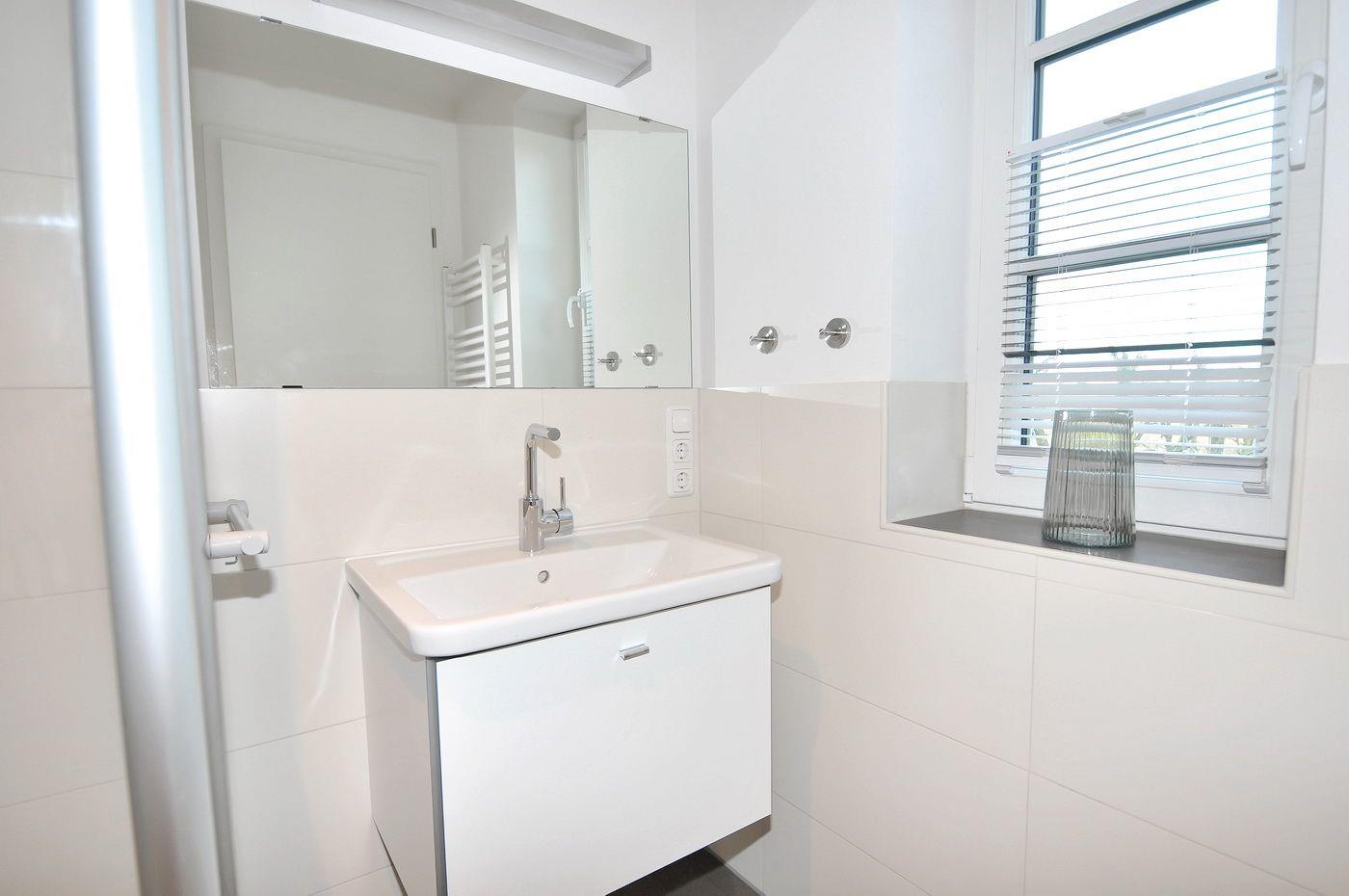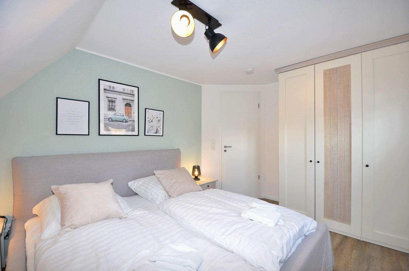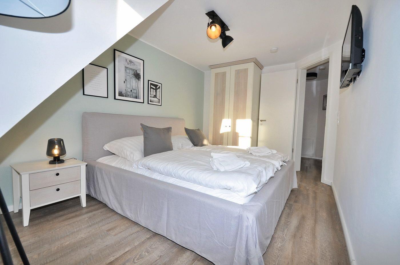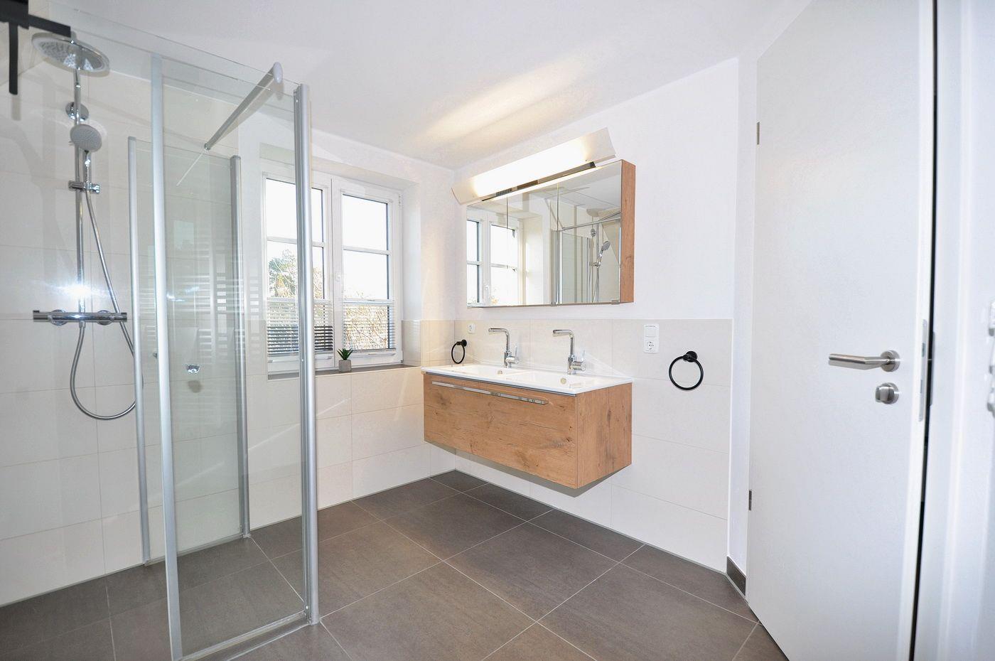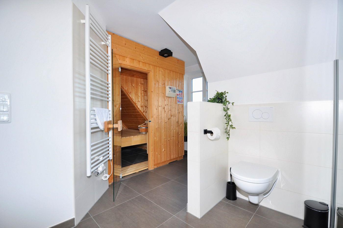 Obergeschoss: 2 Schlafzimmer mit Doppelbett (je 180 x 200 cm - Einzelmatratzen) und TV, ein Duschbad / WC mit ebenerdiger Dusche, Handtuchwärmer und Sauna