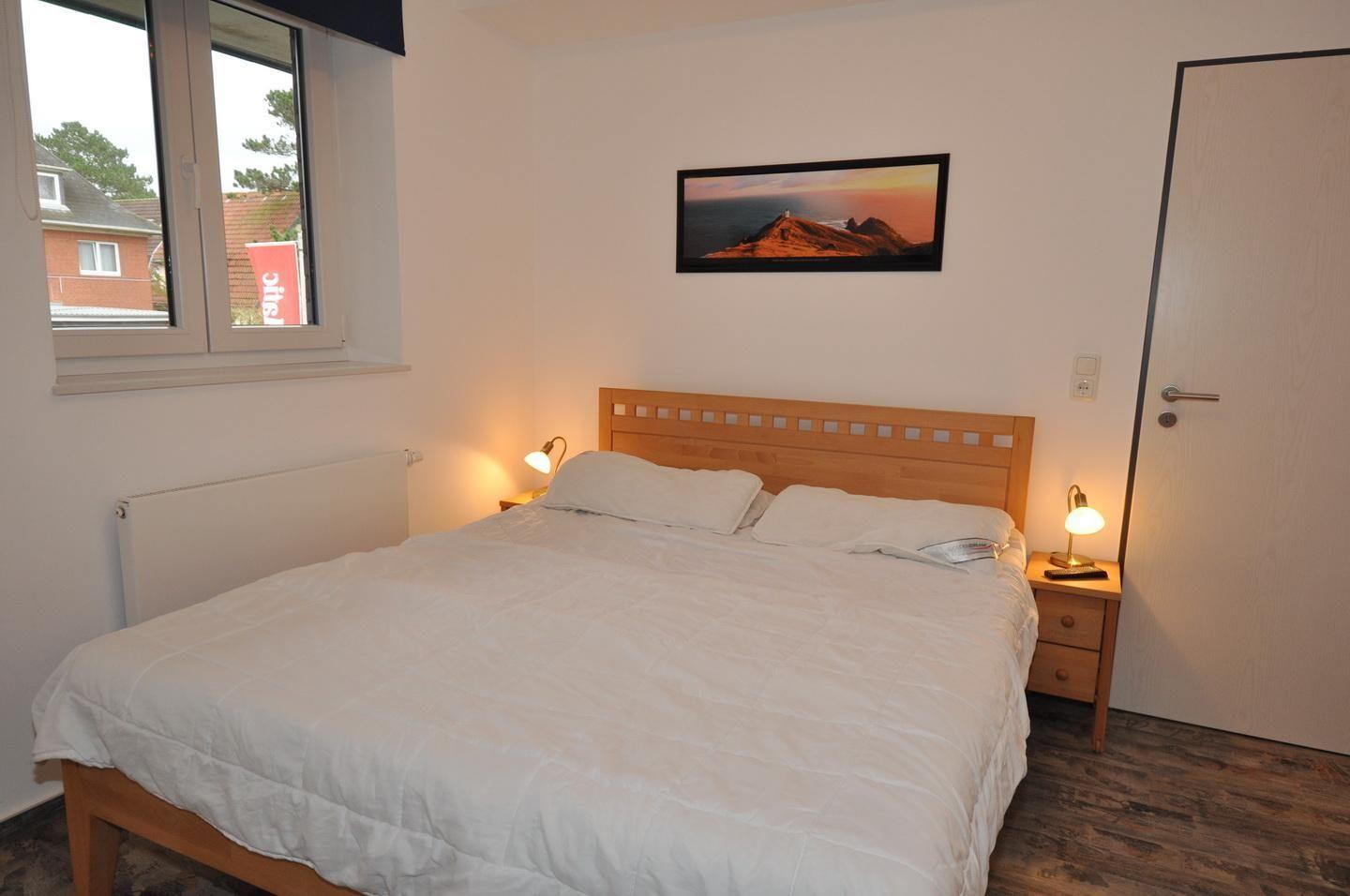 Auf dem Balkon befinden sich Gartenmöbel und ein Strandkorb. Das Fenster im Schlafzimmer ist mit Insektenschutzgittern versehen.