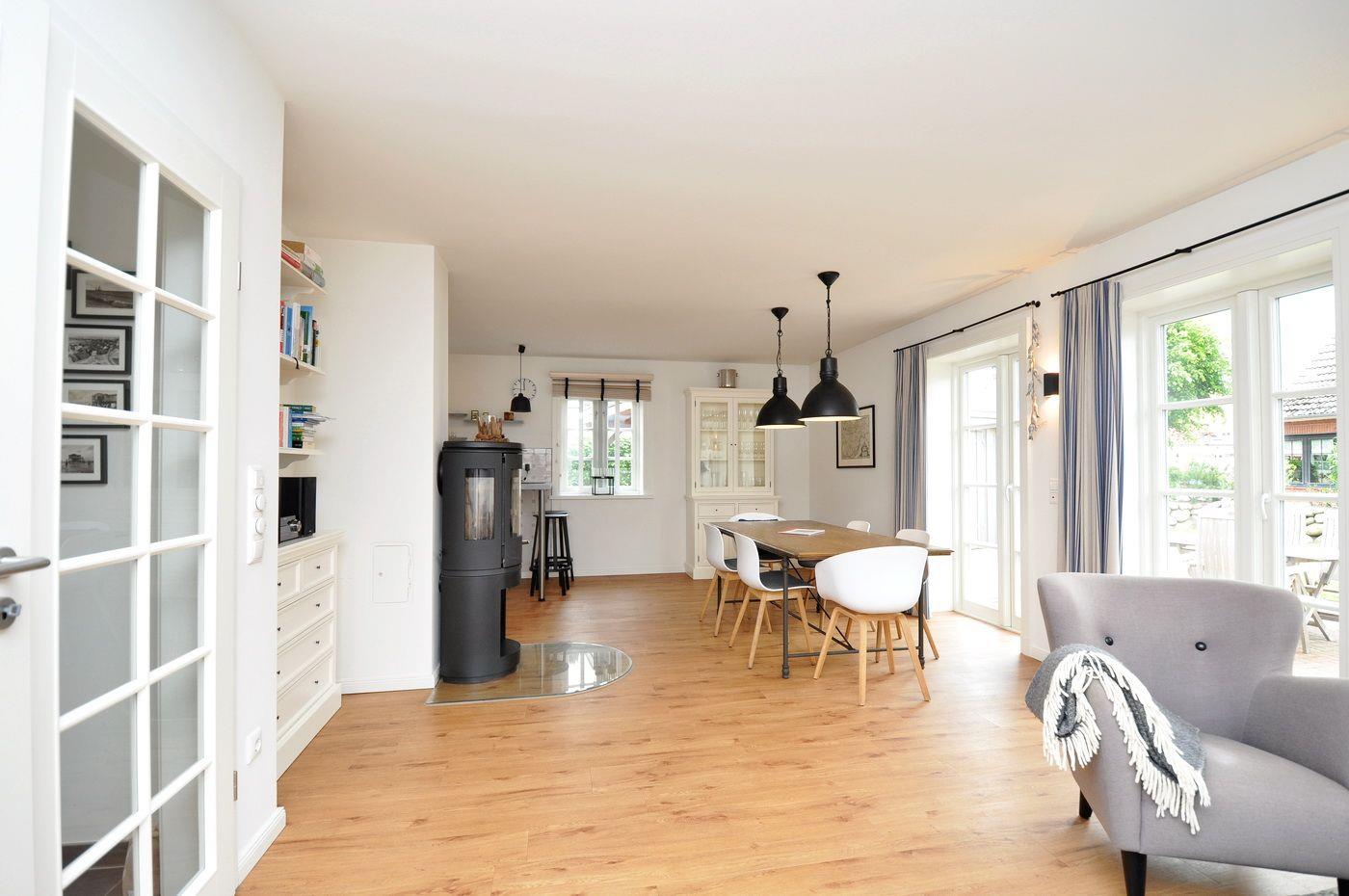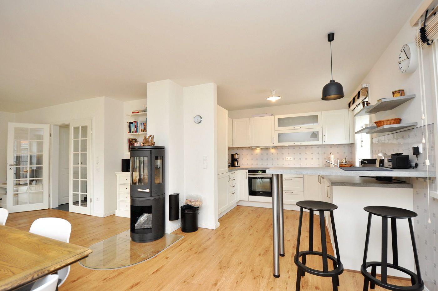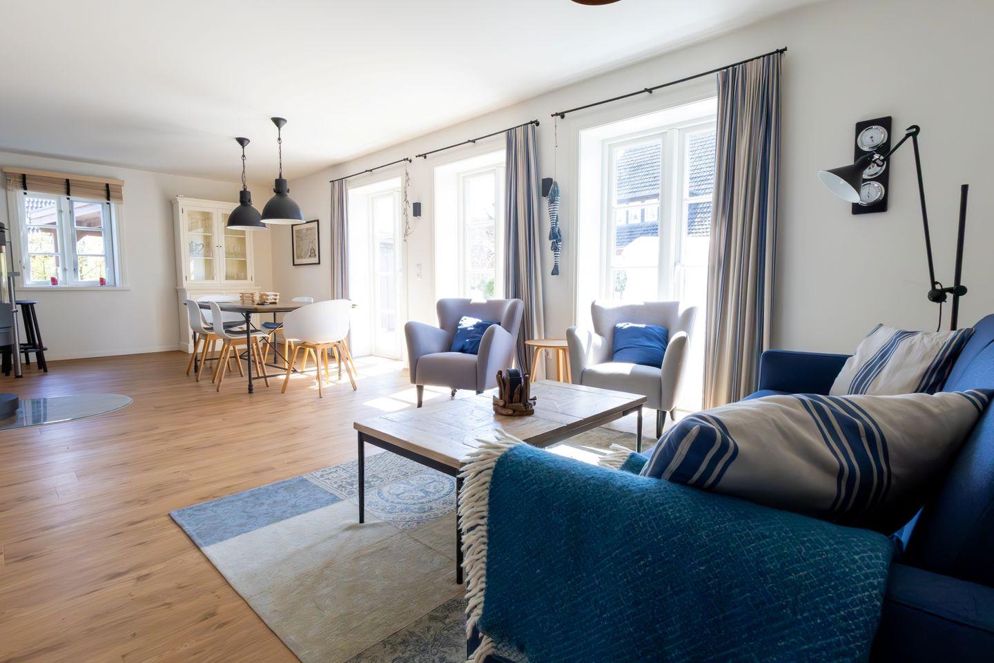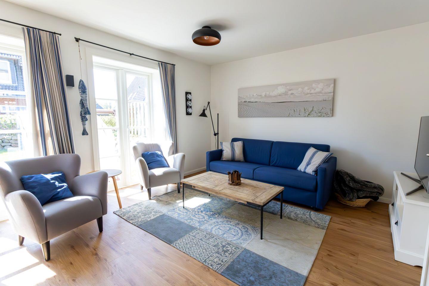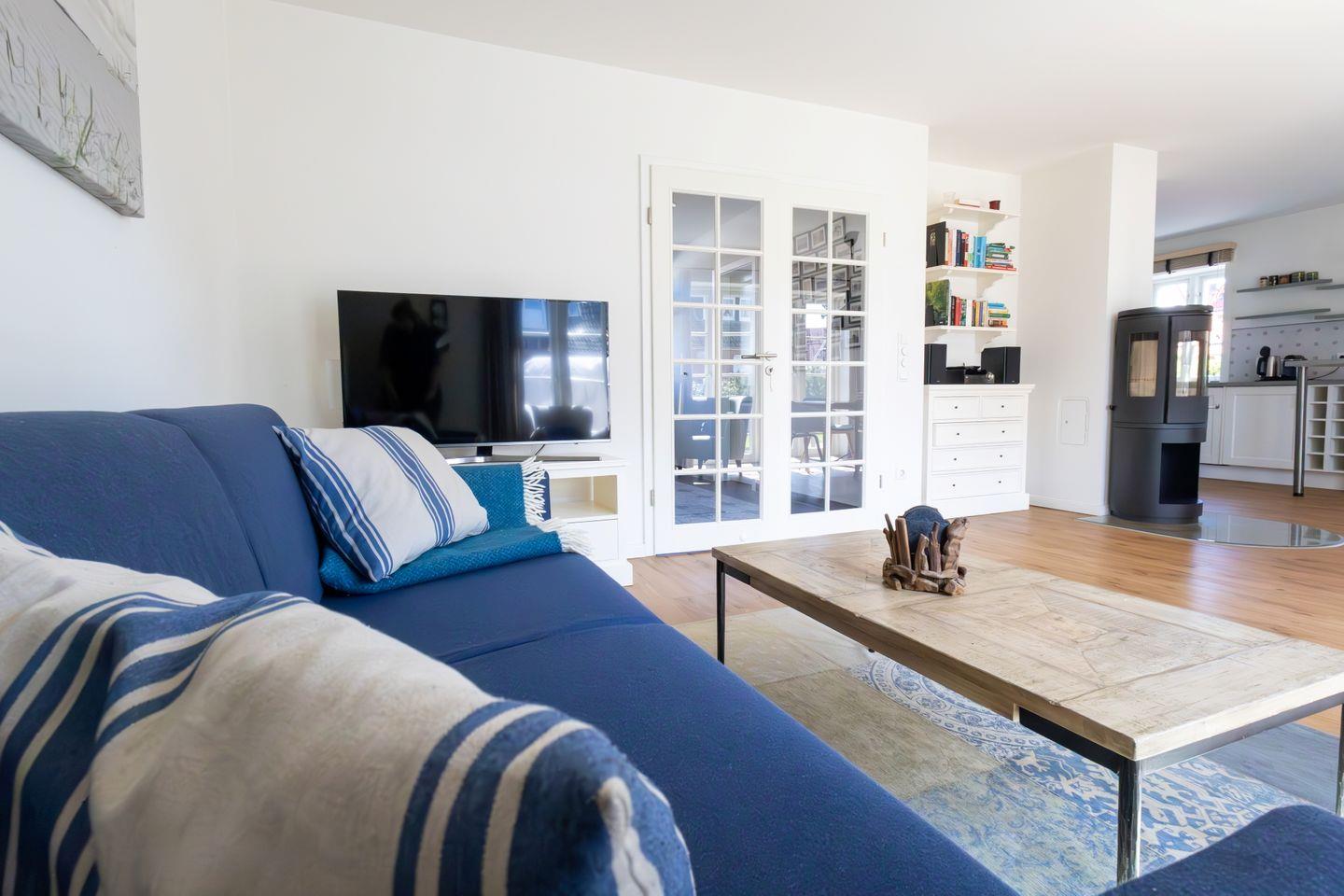 Zur Küchenausstattung gehören auch ein Raclette sowie ein Fondue- und ein Käsefondue-Set. Das qualitativ hochwertige Sofa im Wohnbereich, wie es auch im Berliner Adlon zu finden ist, kann als zusätzliche Schlafmöglichkeit (160 x 195 cm) für 2 Personen genutzt werden. Auf der Terrasse stehen komfortable Teak-Gartenmöbel, sowie ein Strandkorb bereit.