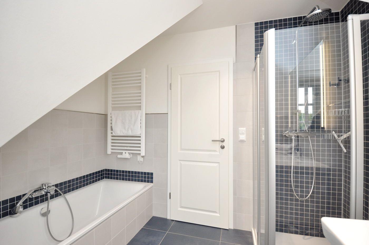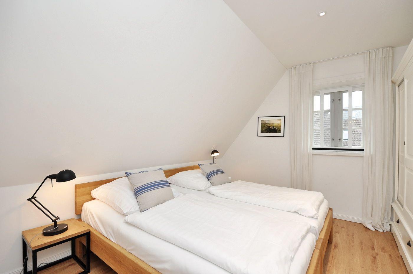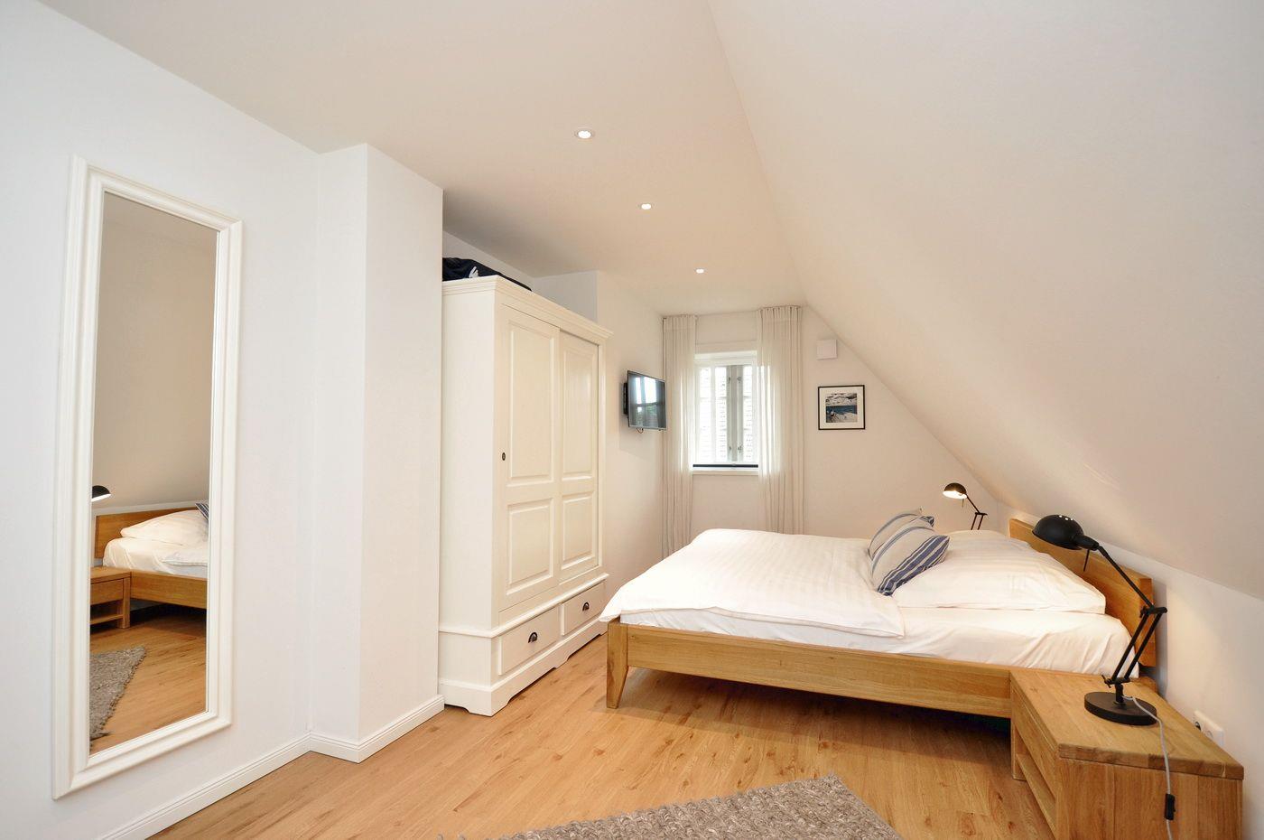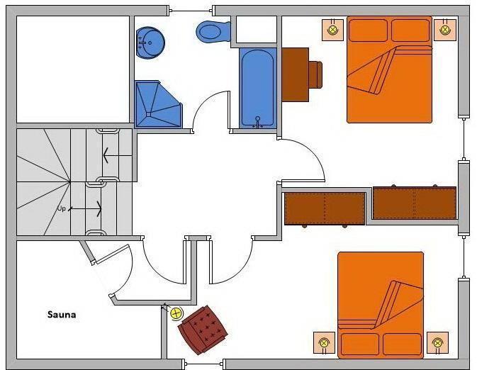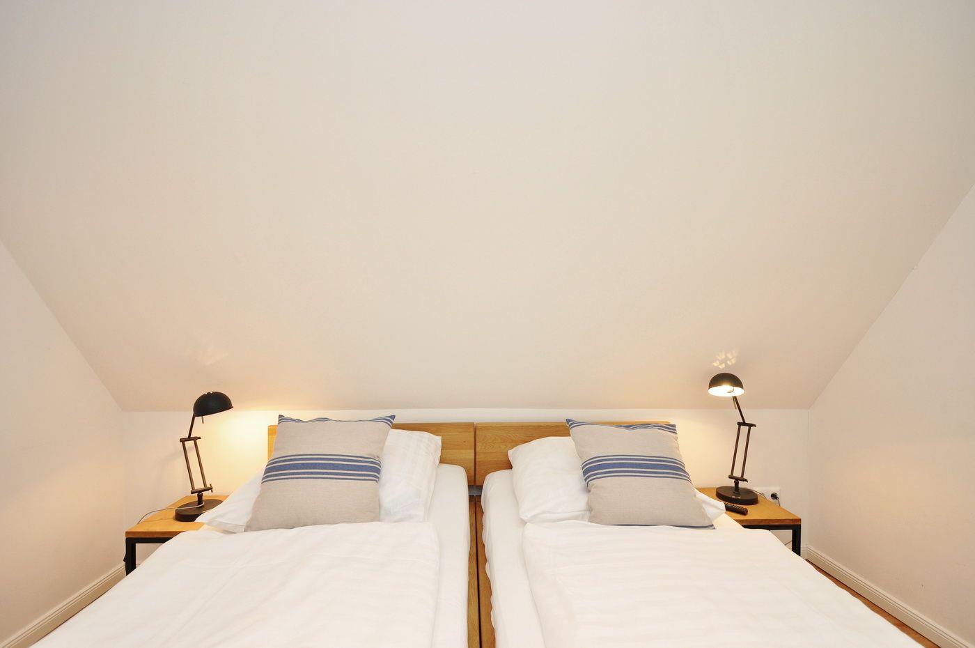 Obergeschoss: ein Schlafzimmer mit Doppelbett (180 x 200 cm), ein Schlafzimmer mit 2 Einzelbetten (je 90 x 200 cm), ein Wannenbad / WC mit separater Dusche, eine Sauna.