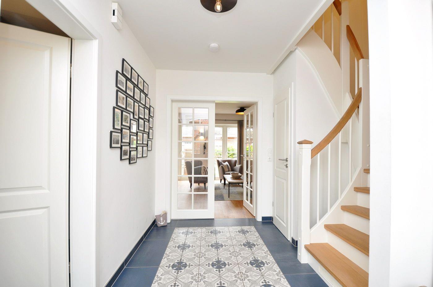 Erdgeschoss: Eingangsbereich, Wohnraum mit offener Küche, Essbereich, Kamin und Zugang zur Terrasse, ein Duschbad / WC