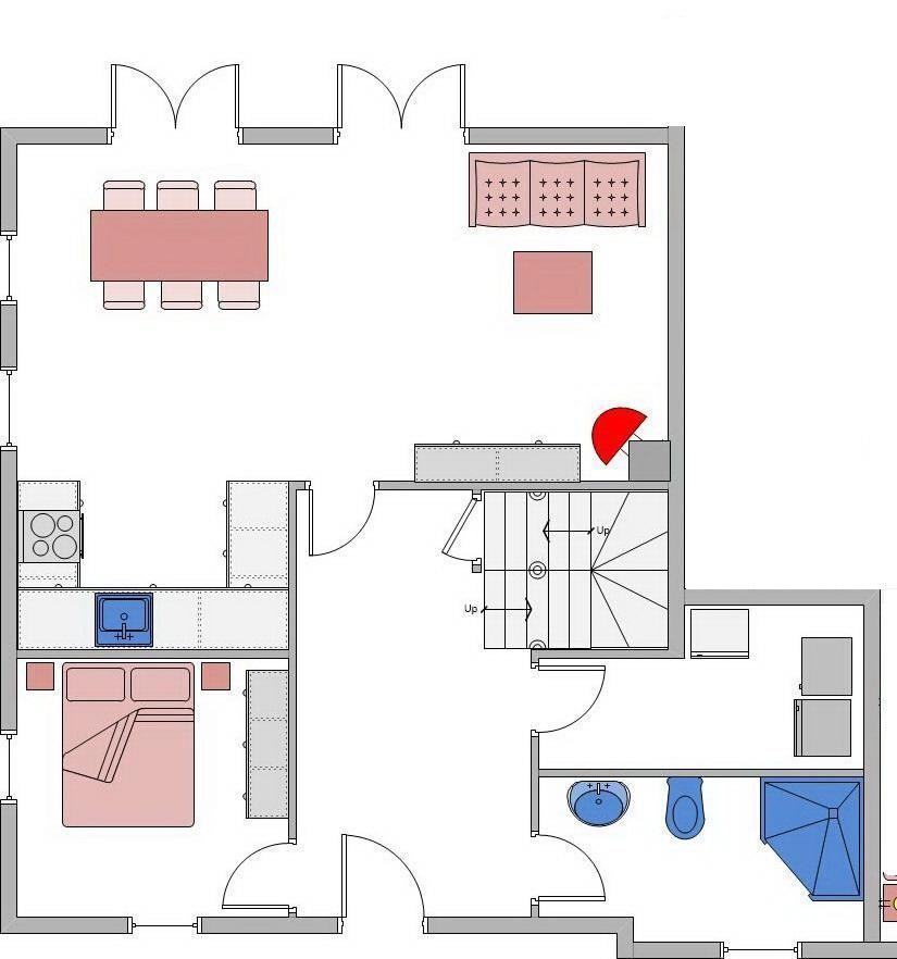 Erdgeschoss: Eingangsbereich, Wohnraum mit integrierter Küche, Essbereich, Kamin und Zugang zur Terrasse, ein Schlafzimmer mit Doppelbett (160 x 200 cm - Einzelmatratzen), ein Duschbad / WC, ein Hauswirtschaftsraum