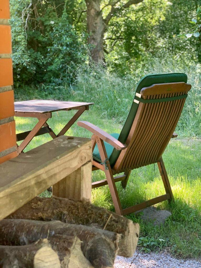 Garten mit Gartenmöbeln und Sitzmöglichkeit am Bach