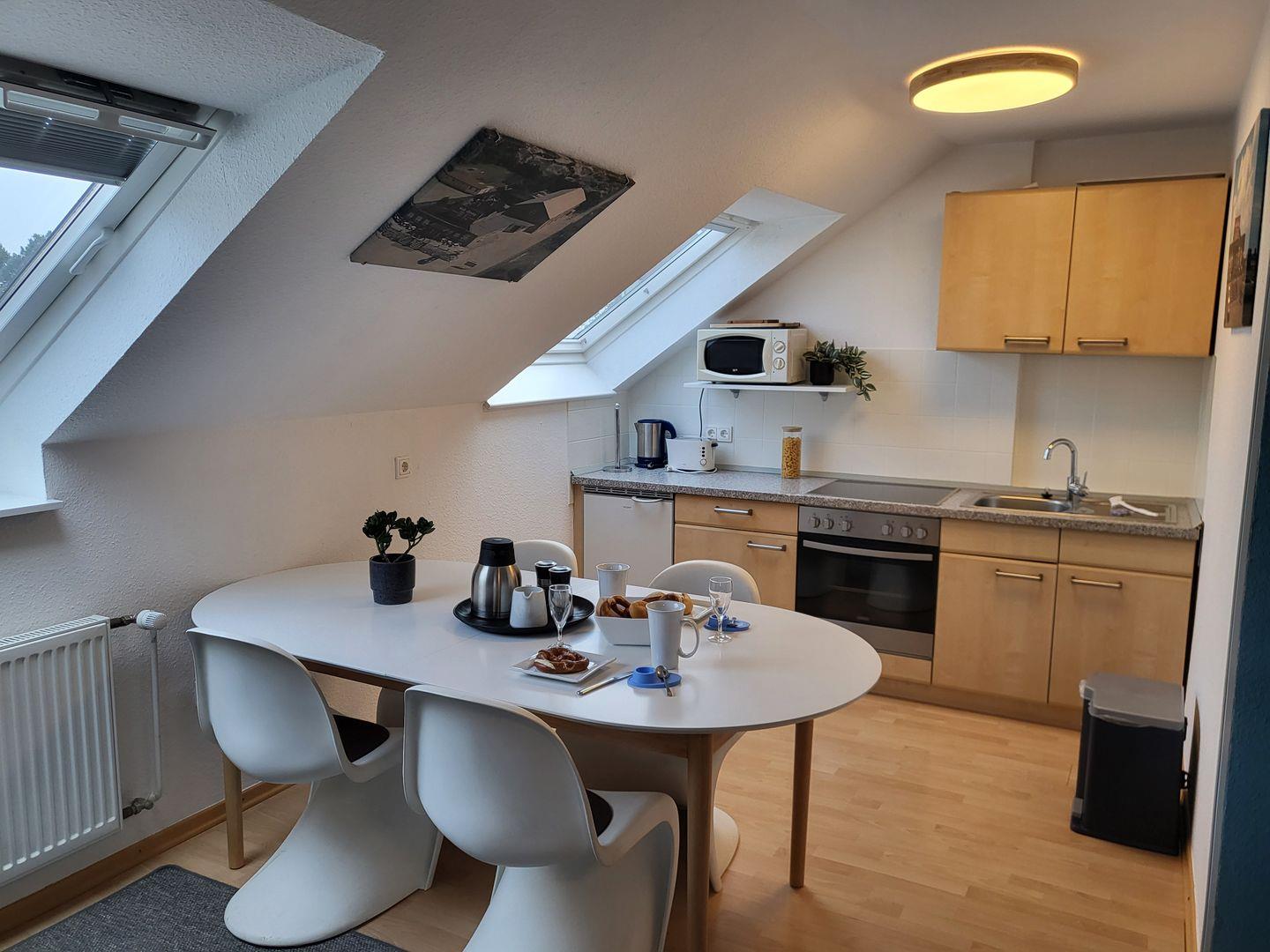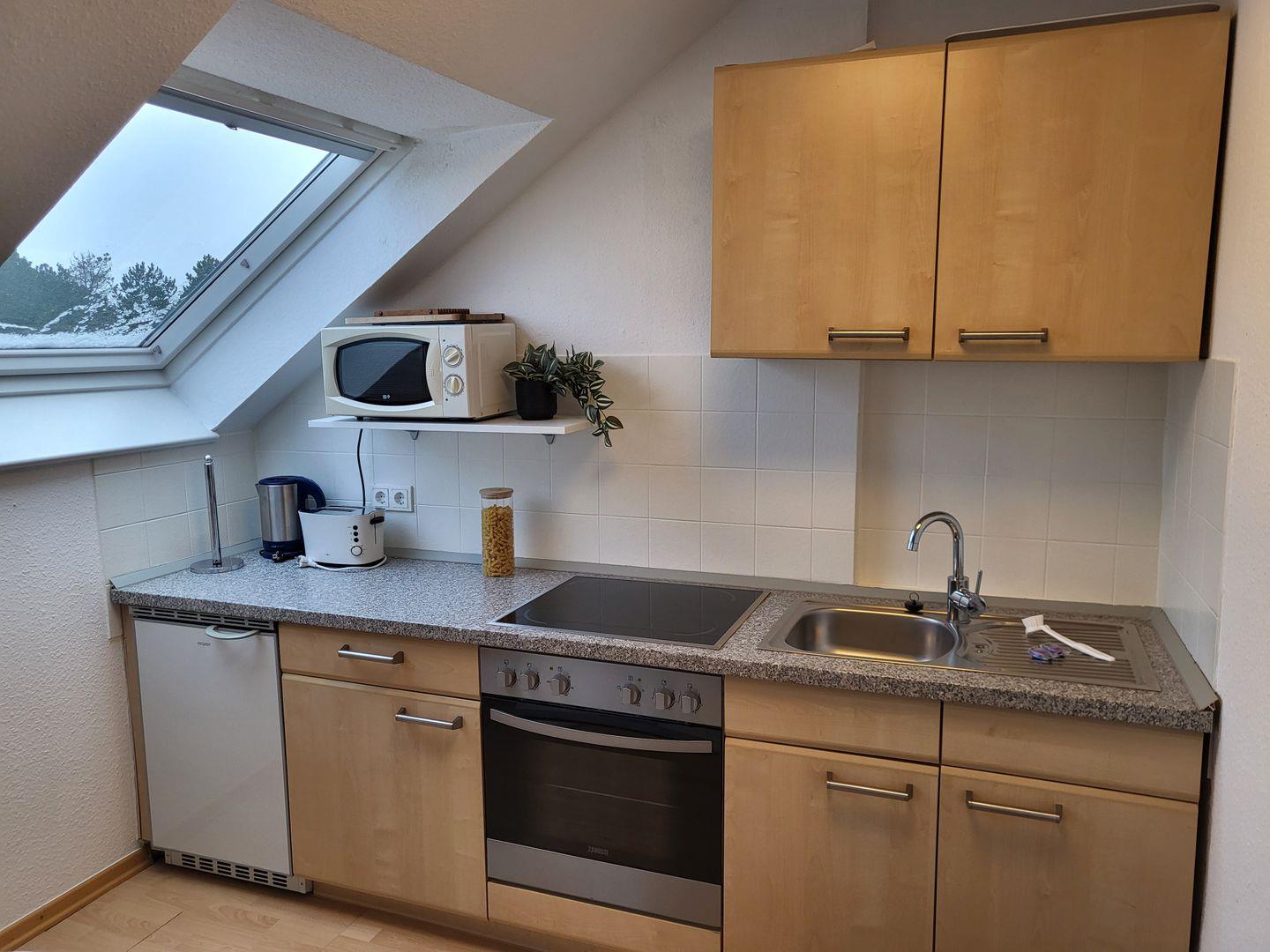 Die offen zum Wohnraum gehaltene Küche verfügt über alle notwendigen Annehmlichkeiten zur Selbstverpflegung: Cerankochfeld, Mikrowelle, Backofen, Kühlschrank mit integriertem Gefrierfach, Kaffeemaschine, Wasserkocher und Toaster.