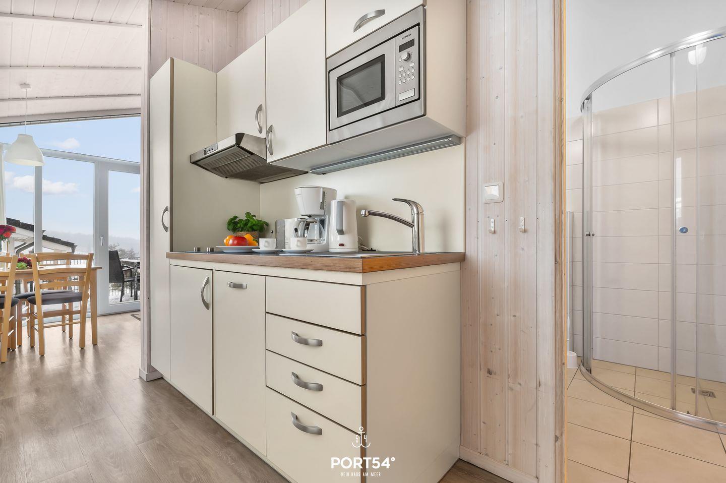 Die angrenzende, kompakte Küche ist bestens ausgestattet und bietet alles, was du brauchst, um gemeinsam zu kochen und kulinarische Genüsse zu zaubern. Der kleine, gemütliche Essbereich lädt zu genussvollen Mahlzeiten und langen Gesprächen ein – ein perfekter Ort, um den Tag Revue passieren zu lassen. Die Küche ist ausgestattet mit 2-Platten-Cerankochfeld, Kühlschrank mit Gefrierfach, Mikrowelle und Kaffeemaschine.