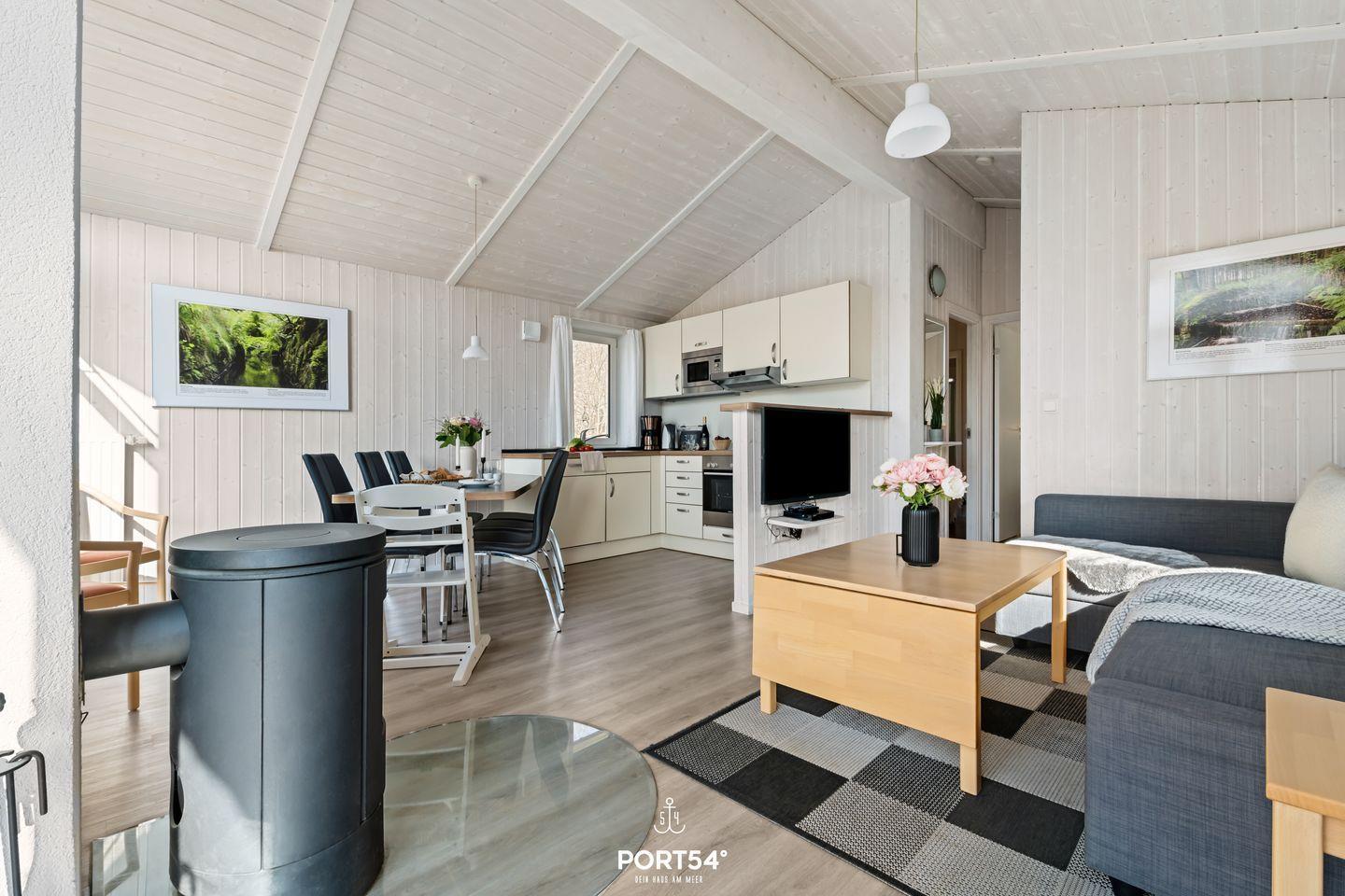 Der offene Wohnbereich ist das Herz des Hauses. Eine gemütliche Couch, rustikale Holzelemente und ein Holzofenkamin sorgen für eine behagliche Atmosphäre, die zum Entspannen einlädt. Große Fenster lassen viel Tageslicht herein und bieten einen malerischen Blick auf die umliegende Natur. Zur Unterhaltung stehen ein Flachbild-TV und eine Musikanlage bereit.
