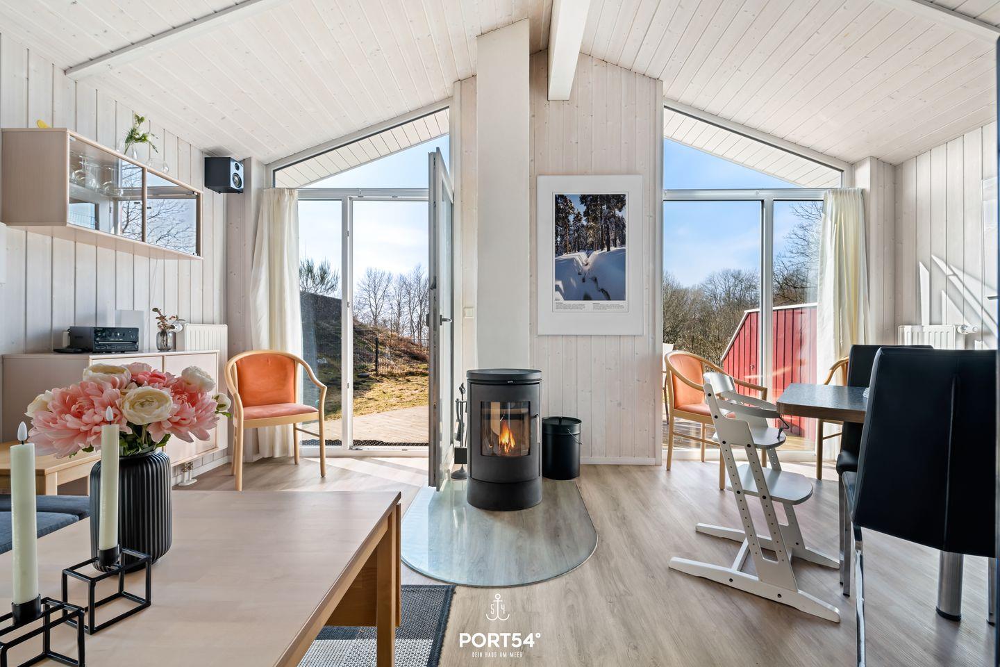 Der offene Wohnbereich ist das Herz des Hauses. Eine gemütliche Couch, rustikale Holzelemente und ein Holzofenkamin sorgen für eine behagliche Atmosphäre, die zum Entspannen einlädt. Große Fenster lassen viel Tageslicht herein und bieten einen malerischen Blick auf die umliegende Natur. Zur Unterhaltung stehen dir ein Flachbild-TV und eine Musikanlage bereit.