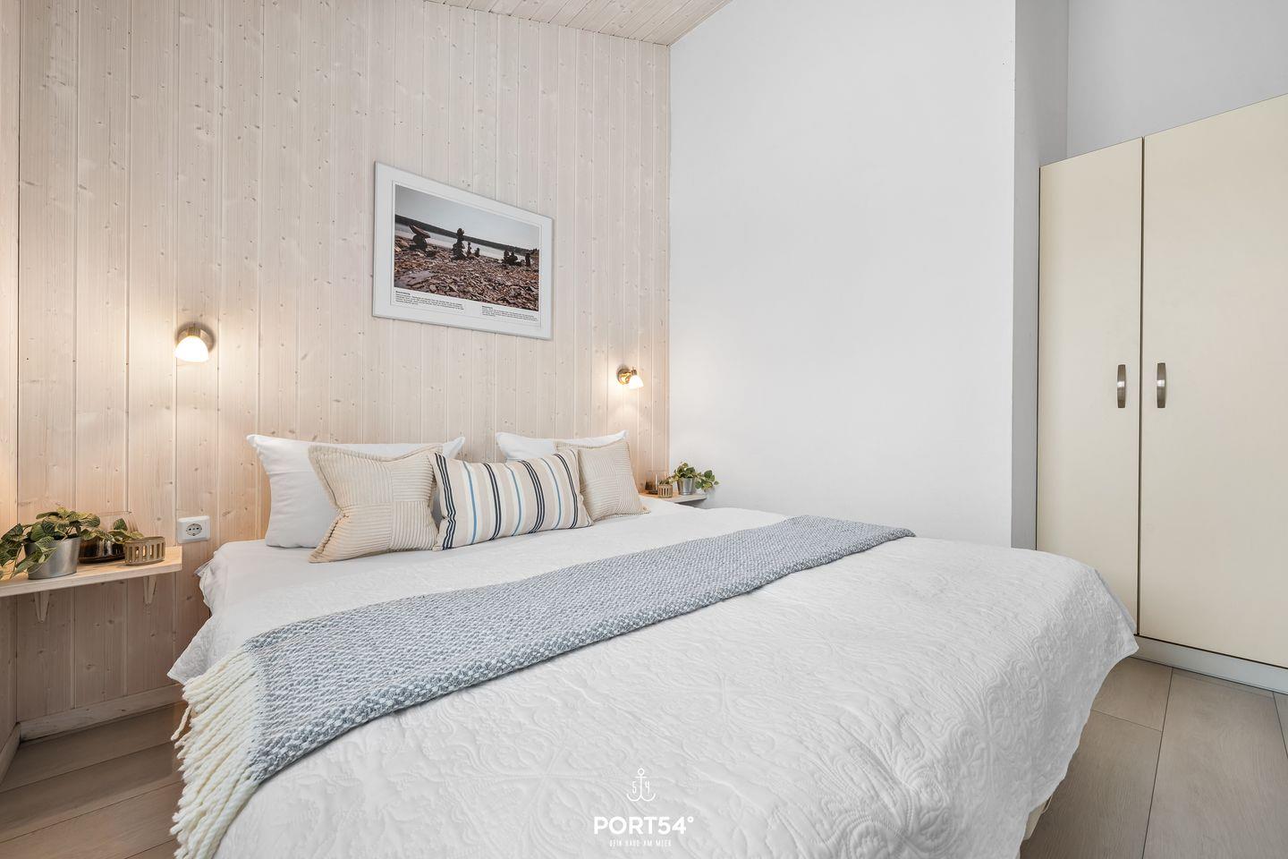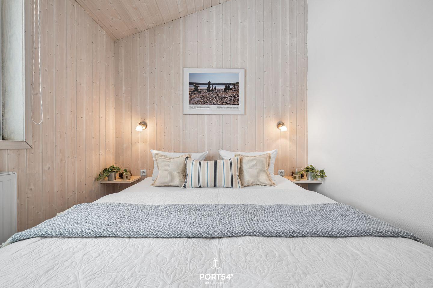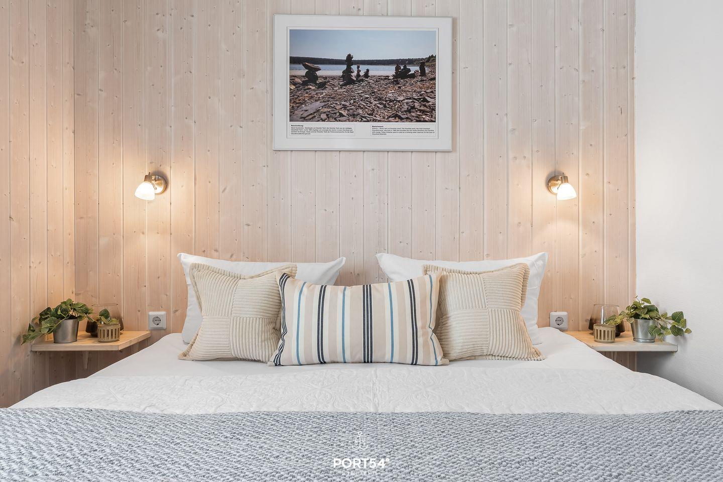 Das Schlafzimmer lädt mit zwei zusammengeschobenen Einzelbetten (zusammen 180 x 200 cm) zu erholsamen Nächten ein. Natürliche Materialien und sanfte Farben schaffen eine beruhigende Atmosphäre. Für zusätzliche Gäste steht im Wohnbereich eine ausziehbare Schlafcouch (140 x 190 cm) bereit, die zwei Personen – ideal für Kinder oder Freunde – bequem Platz bietet.