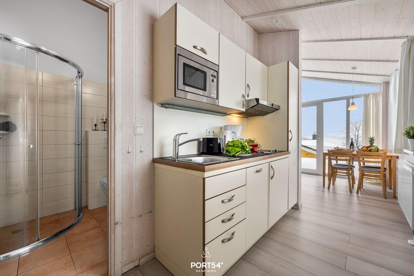 Die angrenzende, kompakte Küche ist vollständig ausgestattet und bietet alles, was du benötigst, um leckere Mahlzeiten zuzubereiten. Neben einem 2-Platten-Cerankochfeld stehen dir ein Kühlschrank mit Gefrierfach, eine Mikrowelle und eine Kaffeemaschine zur Verfügung. Der kleine, einladende Essbereich ist perfekt, um bei gemeinsamen Mahlzeiten und langen Gesprächen die Erlebnisse des Tages Revue passieren zu lassen.