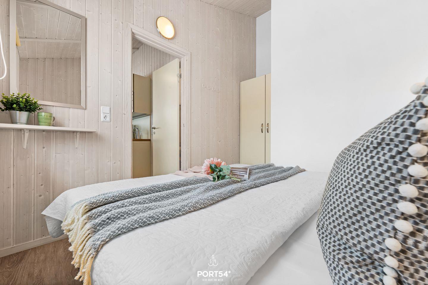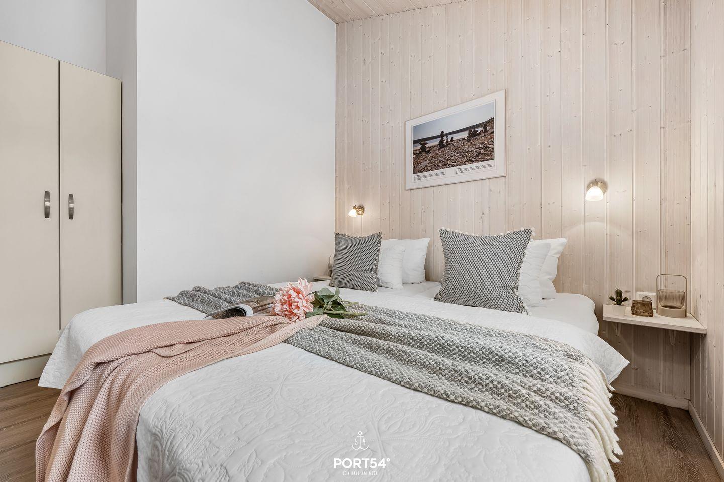 Das Schlafzimmer bietet mit zwei zusammengeschobenen Einzelbetten (zusammen 180x200 cm) einen behaglichen Rückzugsort für zwei Erwachsene. Natürliche Materialien und dezente Farben sorgen für ein entspannendes Ambiente. Für zusätzliche Gäste steht im Wohnbereich eine ausziehbare Schlafcouch (140 x 190 cm) bereit, die zwei Personen – ideal für Kinder oder Freunde – bequem Platz bietet. Bettwäsche und Handtücher können optional hinzugebucht werden.