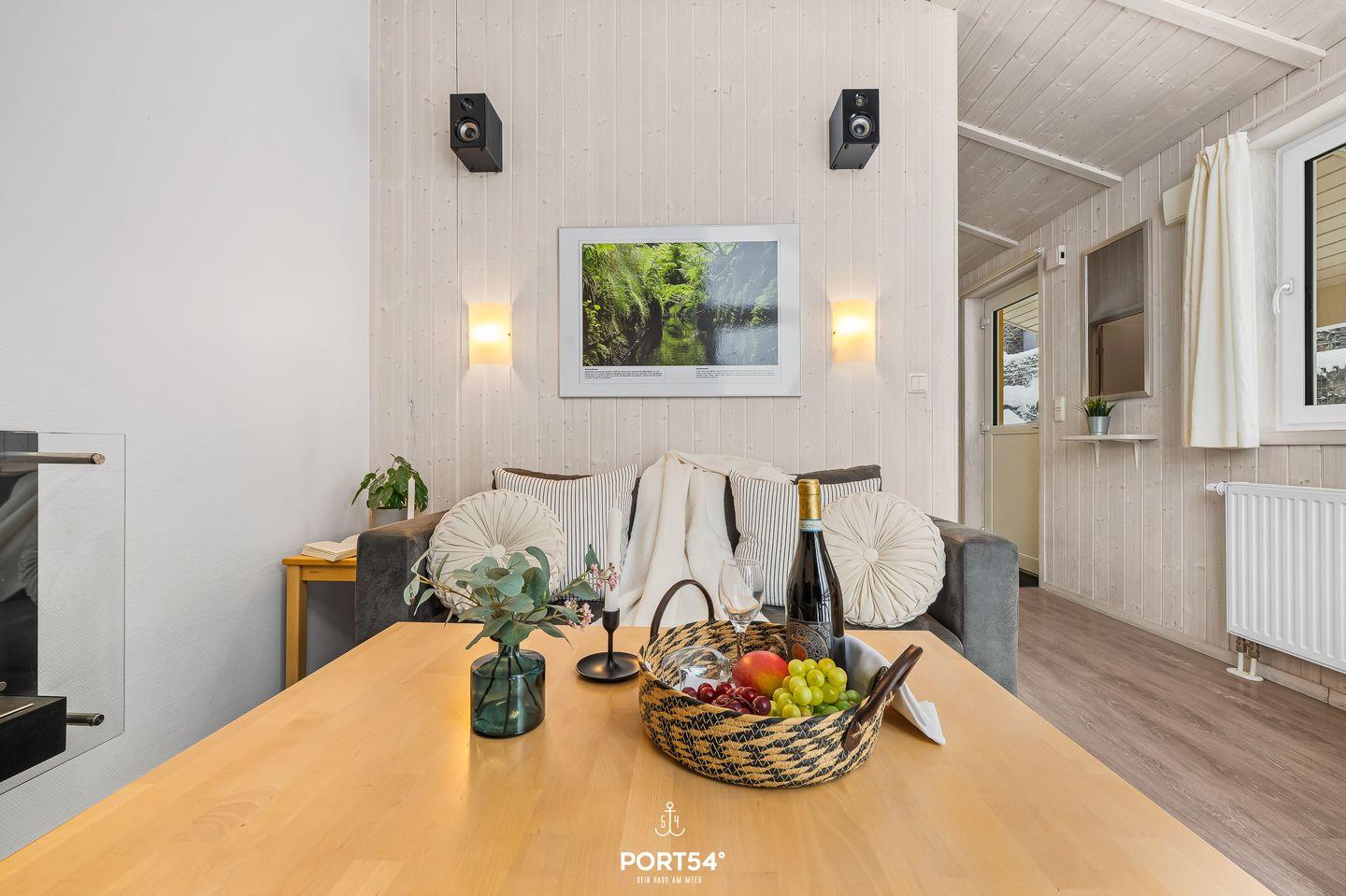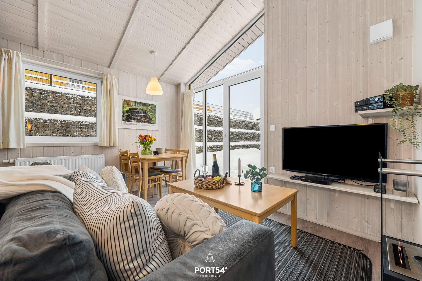 Der offene Wohnbereich bildet das Herzstück des Hauses. Mit seiner gemütlichen Couch, rustikalen Holzelementen und einem Bio-Ethanol-Kaminofen lädt er zu entspannten Abenden in wohliger Atmosphäre ein. Große Fenster holen die umliegende Natur ins Innere und lassen den Raum lichtdurchfluten. Hier kannst du auf der Couch entspannen, ein Buch lesen oder bei einer Tasse Tee den Ausblick genießen. Ein Flachbild-TV und eine Musikanlage sorgen für zusätzliche Unterhaltung.