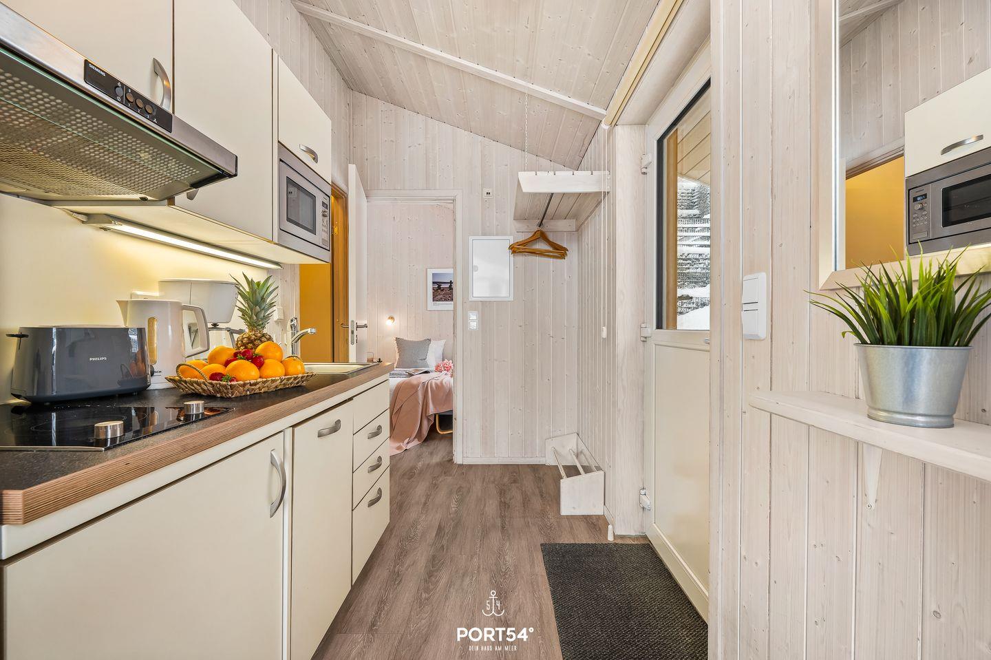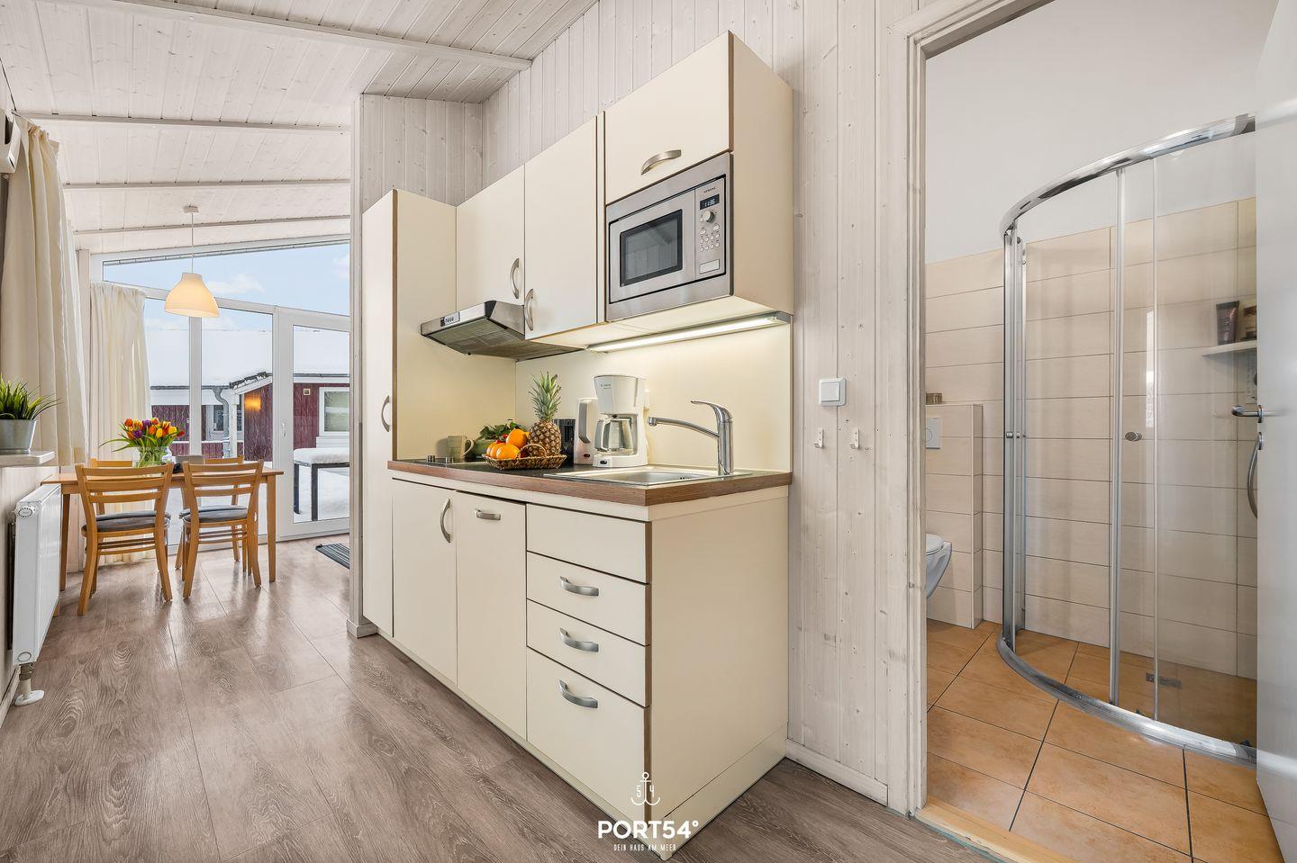 Die angrenzende, kompakte Küche ist bestens ausgestattet und bietet alles, was du brauchst, um gemeinsam zu kochen und kulinarische Genüsse zu zaubern. Der kleine, gemütliche Essbereich lädt zu genussvollen Mahlzeiten und langen Gesprächen ein – ein perfekter Ort, um den Tag Revue passieren zu lassen. Die Küche ist ausgestattet mit 2-Platten-Cerankochfeld, Kühlschrank mit Gefrierfach, Mikrowelle und Kaffeemaschine.