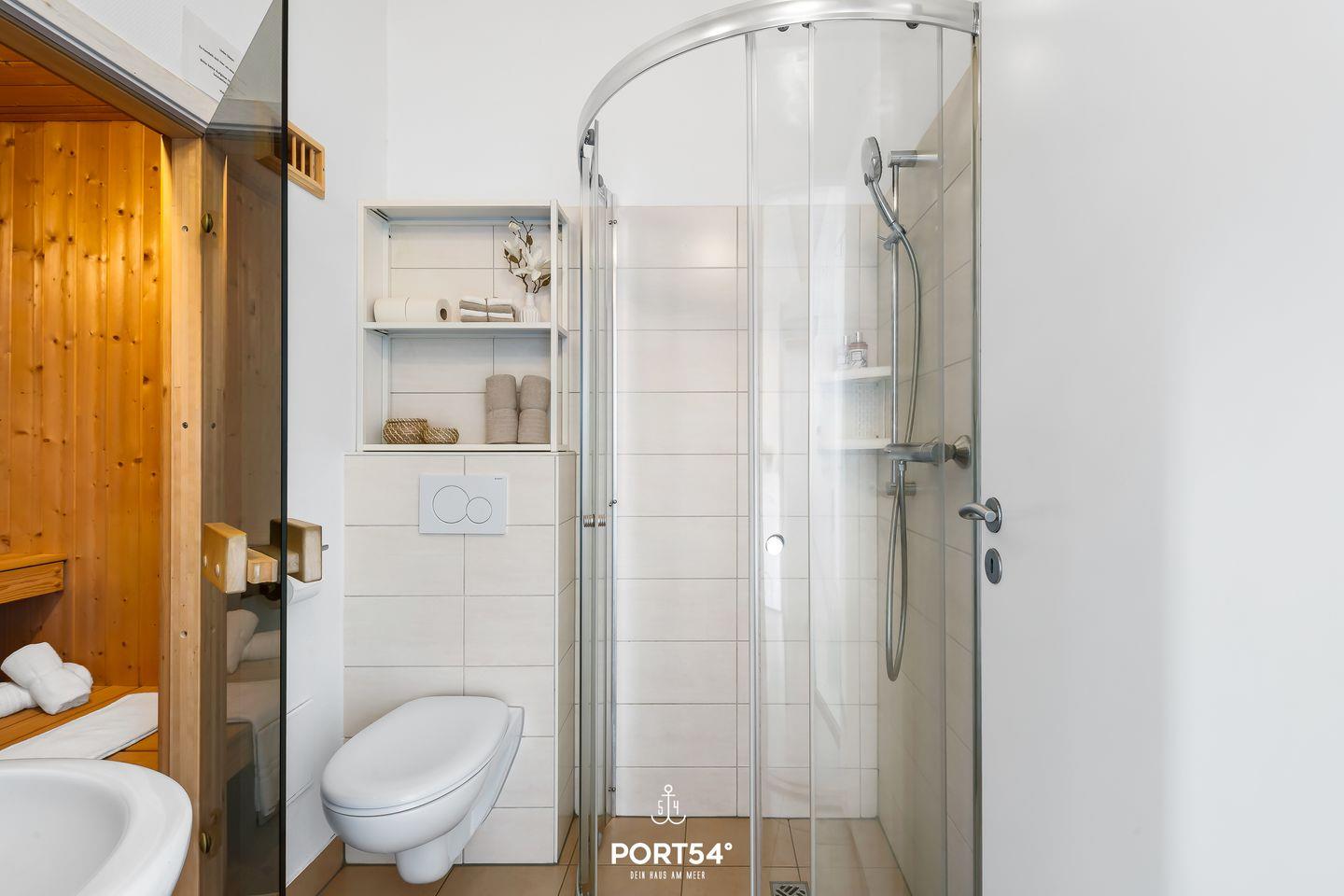 • Bad: Fußbodenheizung für warme Füße und ein Badregal – ein seltenes Extra für all Ihre Pflegeprodukte.
