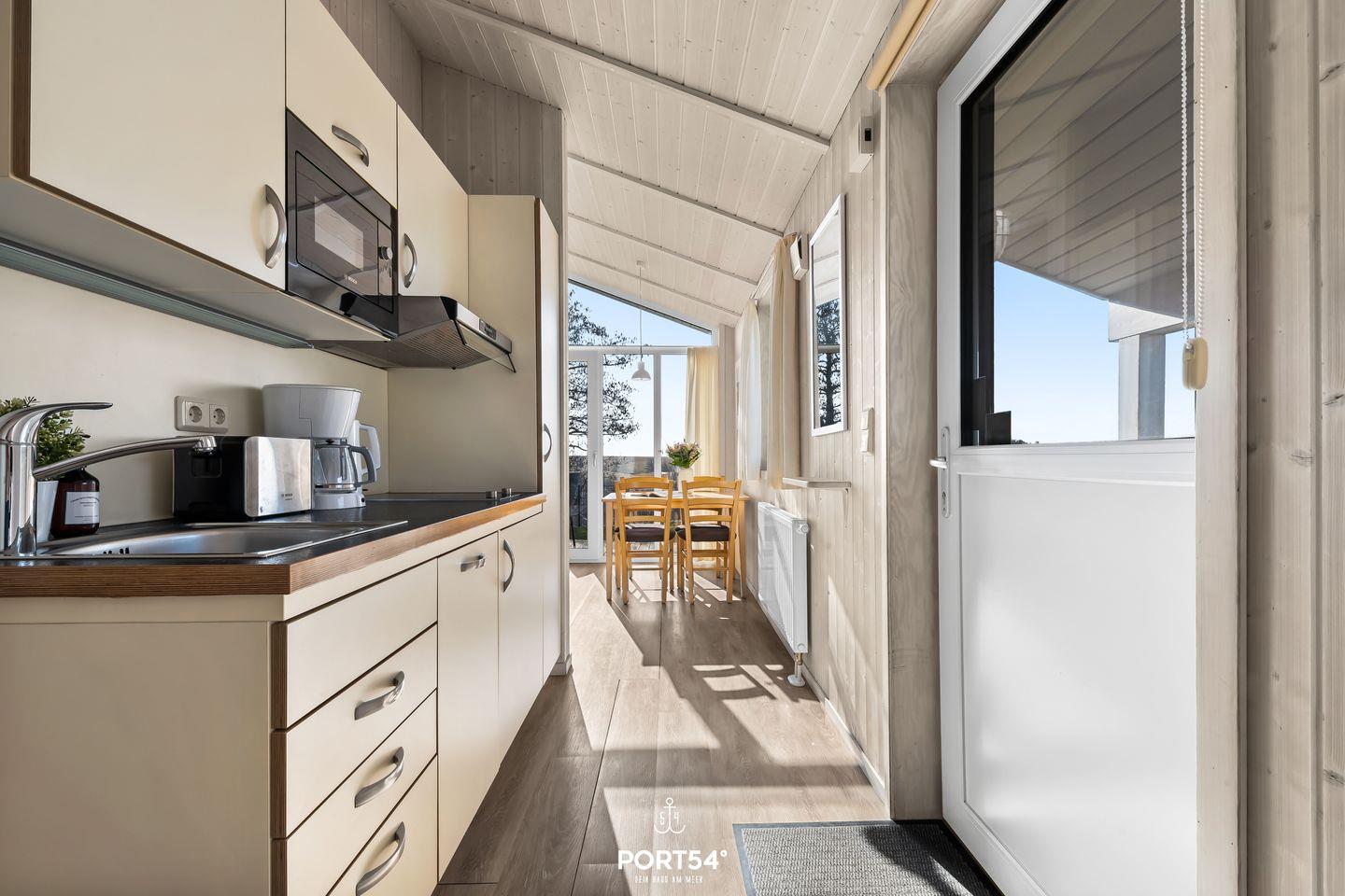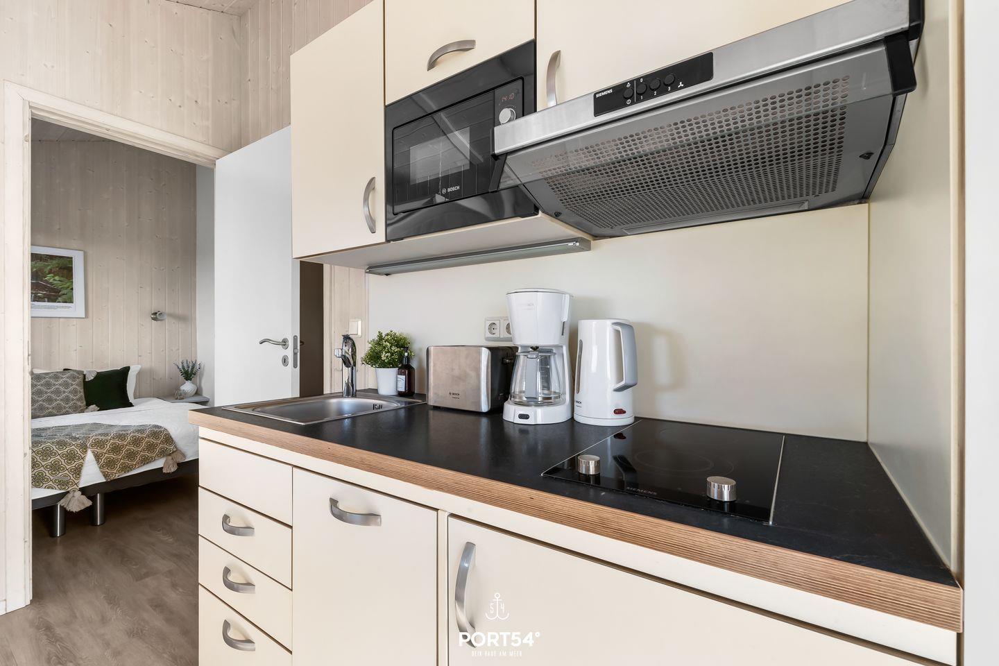 Die angrenzende, kompakte Küche ist bestens ausgestattet und bietet alles, was du brauchst, um gemeinsam zu kochen und kulinarische Genüsse zu zaubern. Der kleine, gemütliche Essbereich lädt zu genussvollen Mahlzeiten und langen Gesprächen ein – ein perfekter Ort, um den Tag Revue passieren zu lassen. Die Küche ist ausgestattet mit 2-Platten-Cerankochfeld, Kühlschrank mit Gefrierfach, Mikrowelle und Kaffeemaschine.