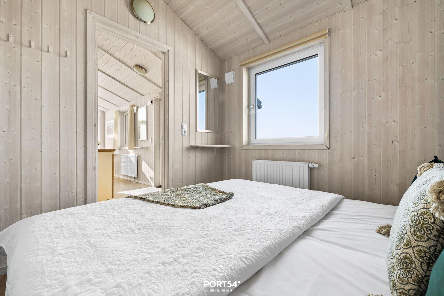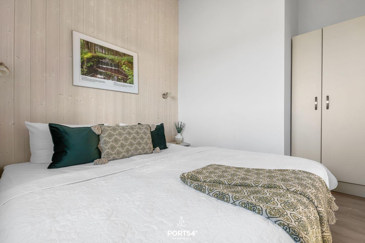 Das Schlafzimmer bietet mit zwei zusammengeschobenen Einzelbetten (zusammen 180 x 200 cm) einen behaglichen Rückzugsort für zwei Erwachsene. Natürliche Materialien und dezente Farben sorgen für ein entspannendes Ambiente. Für zusätzliche Gäste steht im Wohnbereich eine ausziehbare Schlafcouch (140 x 190 cm) bereit, die zwei Personen – ideal für Kinder oder Freunde – bequem Platz bietet. Bettwäsche und Handtücher können optional hinzu gebucht werden.