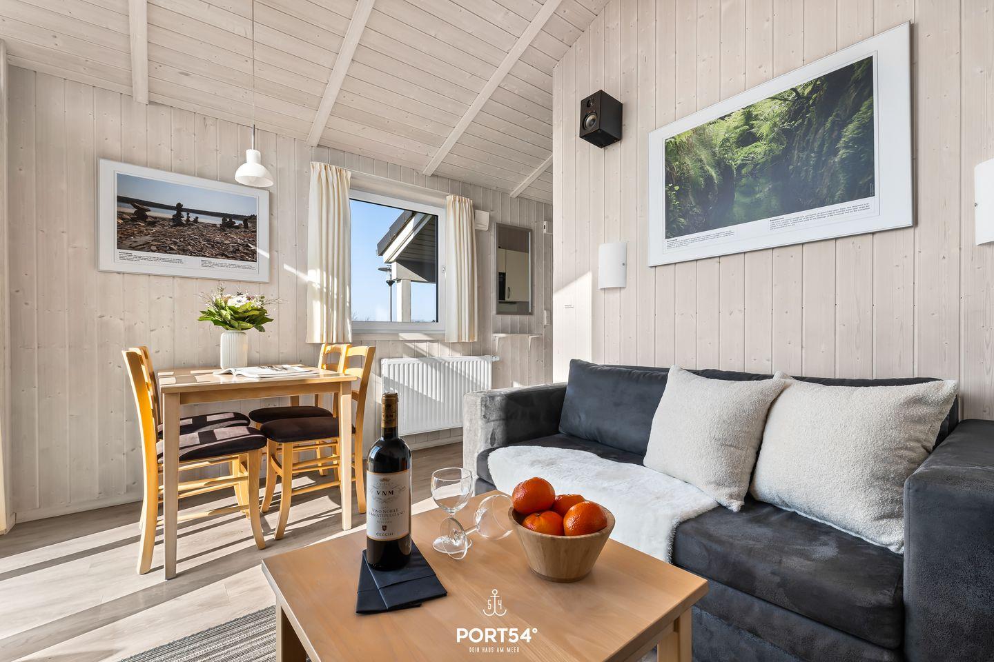 Der offene Wohnbereich bildet das Herzstück des Hauses. Mit seiner gemütlichen Couch, rustikalen Holzelementen und einem Bio-Ethanol-Kaminofen lädt er zu entspannten Abenden in wohliger Atmosphäre ein. Große Fenster holen die umliegende Natur ins Innere und lassen den Raum lichtdurchfluten. Hier kannst du auf der Couch entspannen, ein Buch lesen oder bei einer Tasse Tee den Ausblick genießen. Ein Flachbild-TV und eine Musikanlage sorgen für zusätzliche Unterhaltung.