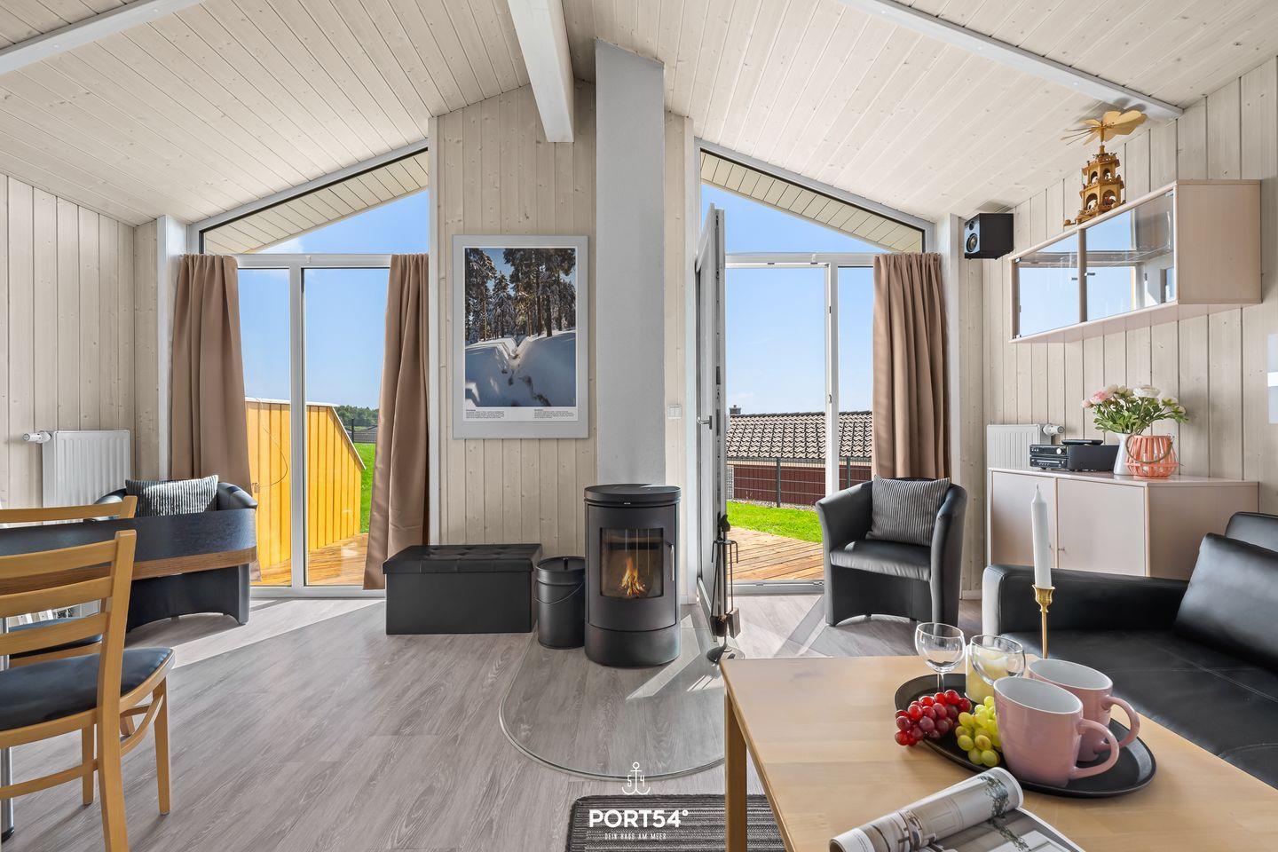 Der offene Wohnbereich ist das Herz des Hauses. Eine gemütliche Couch, rustikale Holzelemente und ein Holzofenkamin sorgen für eine behagliche Atmosphäre, die zum Entspannen einlädt. Große Fenster lassen viel Tageslicht herein und bieten einen malerischen Blick auf die umliegende Natur. Zur Unterhaltung stehen ein Flachbild-TV und eine Musikanlage bereit.