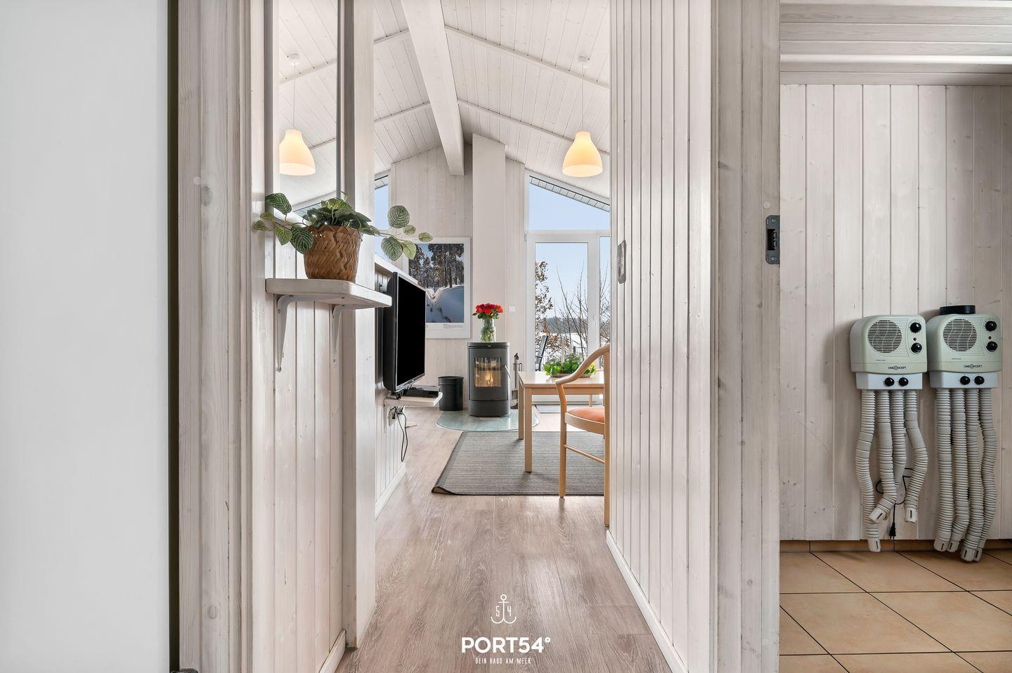 Der offene Wohnbereich ist das Herz des Hauses. Eine gemütliche Couch, rustikale Holzelemente und ein Holzofenkamin sorgen für eine behagliche Atmosphäre, die zum Entspannen einlädt. Große Fenster lassen viel Tageslicht herein und bieten einen malerischen Blick auf die umliegende Natur. Zur Unterhaltung stehen ein Flachbild-TV und eine Musikanlage bereit.