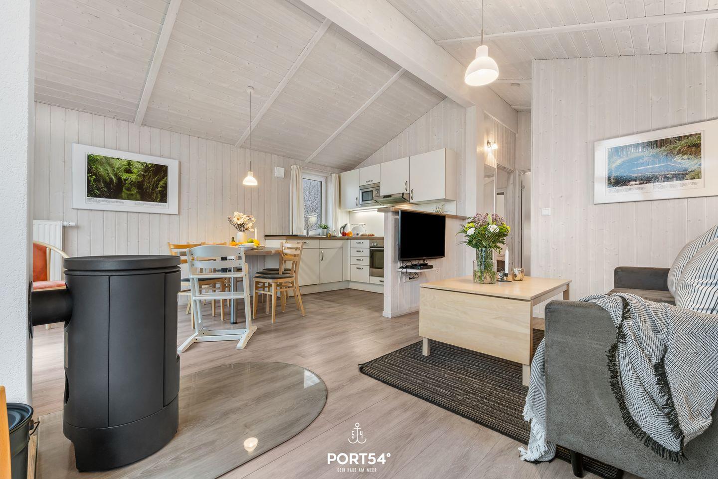 Der offene Wohnbereich ist das Herz des Hauses. Eine gemütliche Couch, rustikale Holzelemente und ein Holzofenkamin sorgen für eine behagliche Atmosphäre, die zum Entspannen einlädt. Große Fenster lassen viel Tageslicht herein und bieten einen malerischen Blick auf die umliegende Natur. Zur Unterhaltung stehen dir ein Flachbild-TV und eine Musikanlage bereit.
