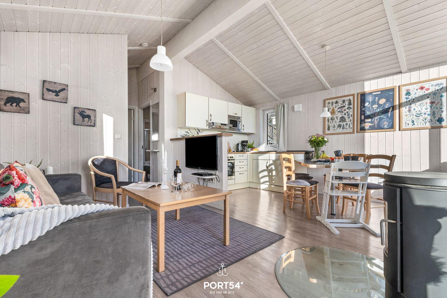 Der offene Wohnbereich ist das Herz des Hauses. Eine gemütliche Couch, rustikale Holzelemente und ein Holzofenkamin sorgen für eine behagliche Atmosphäre, die zum Entspannen einlädt. Große Fenster lassen viel Tageslicht herein und bieten einen malerischen Blick auf die umliegende Natur. Zur Unterhaltung stehen dir ein Flachbild-TV und eine Musikanlage bereit.