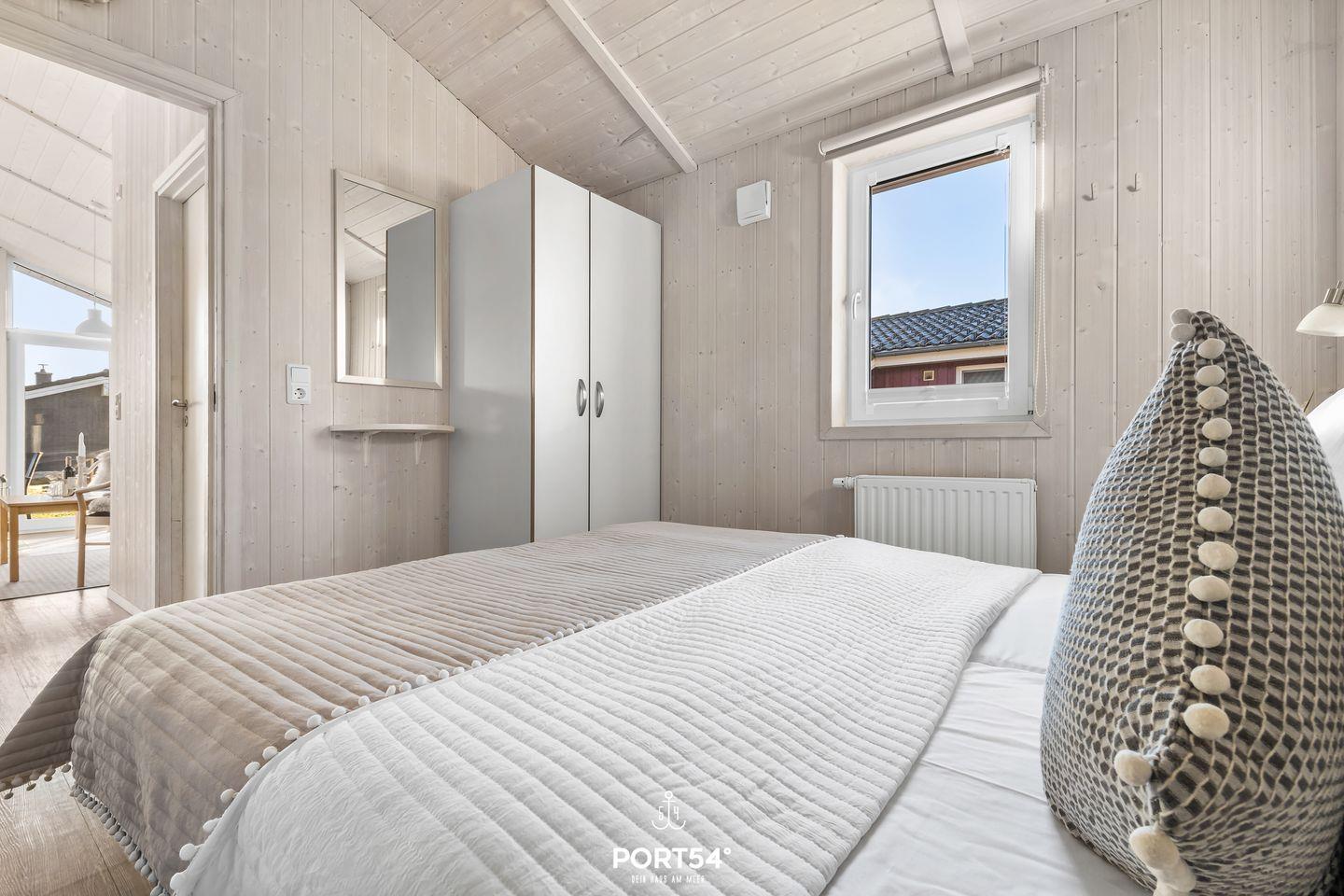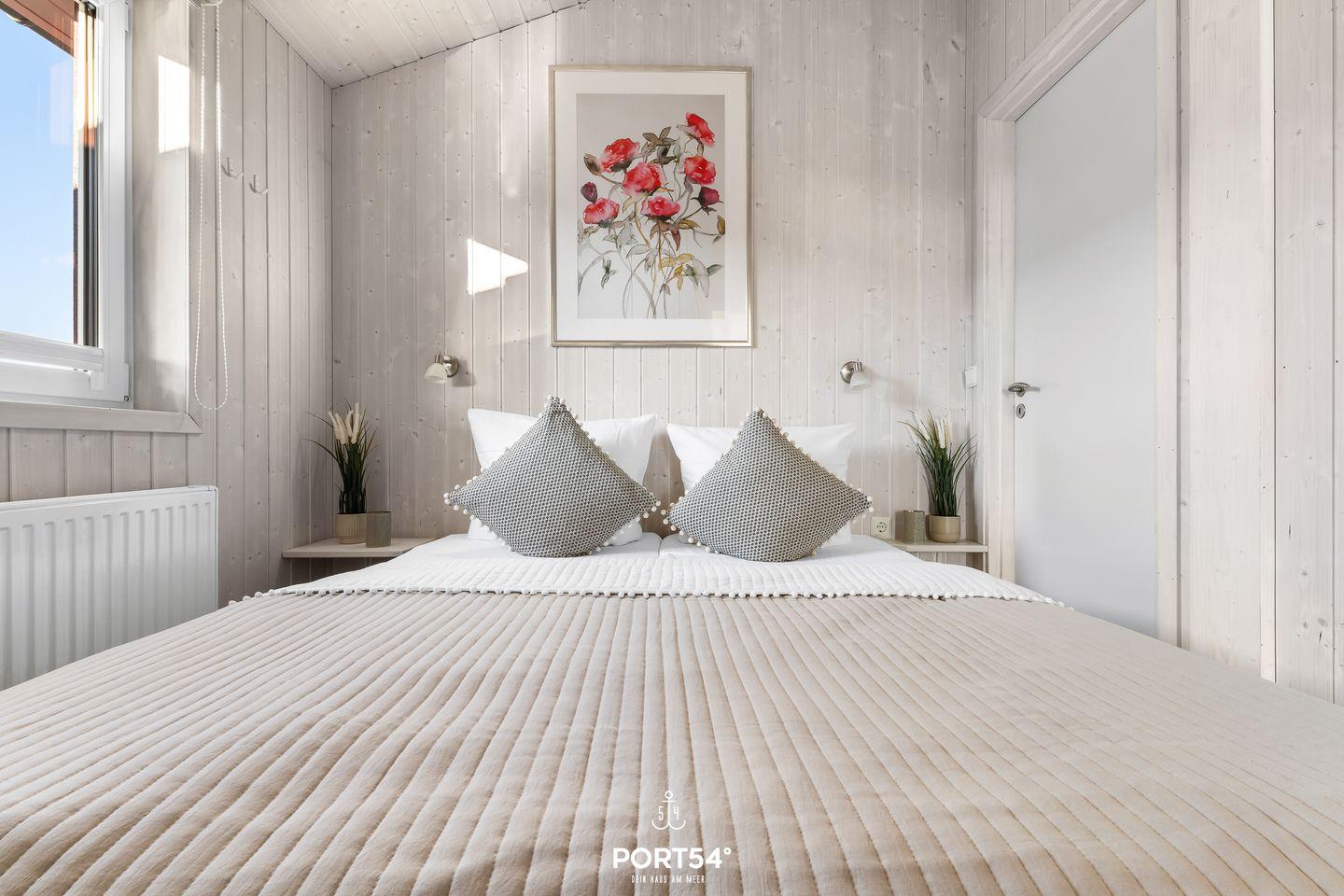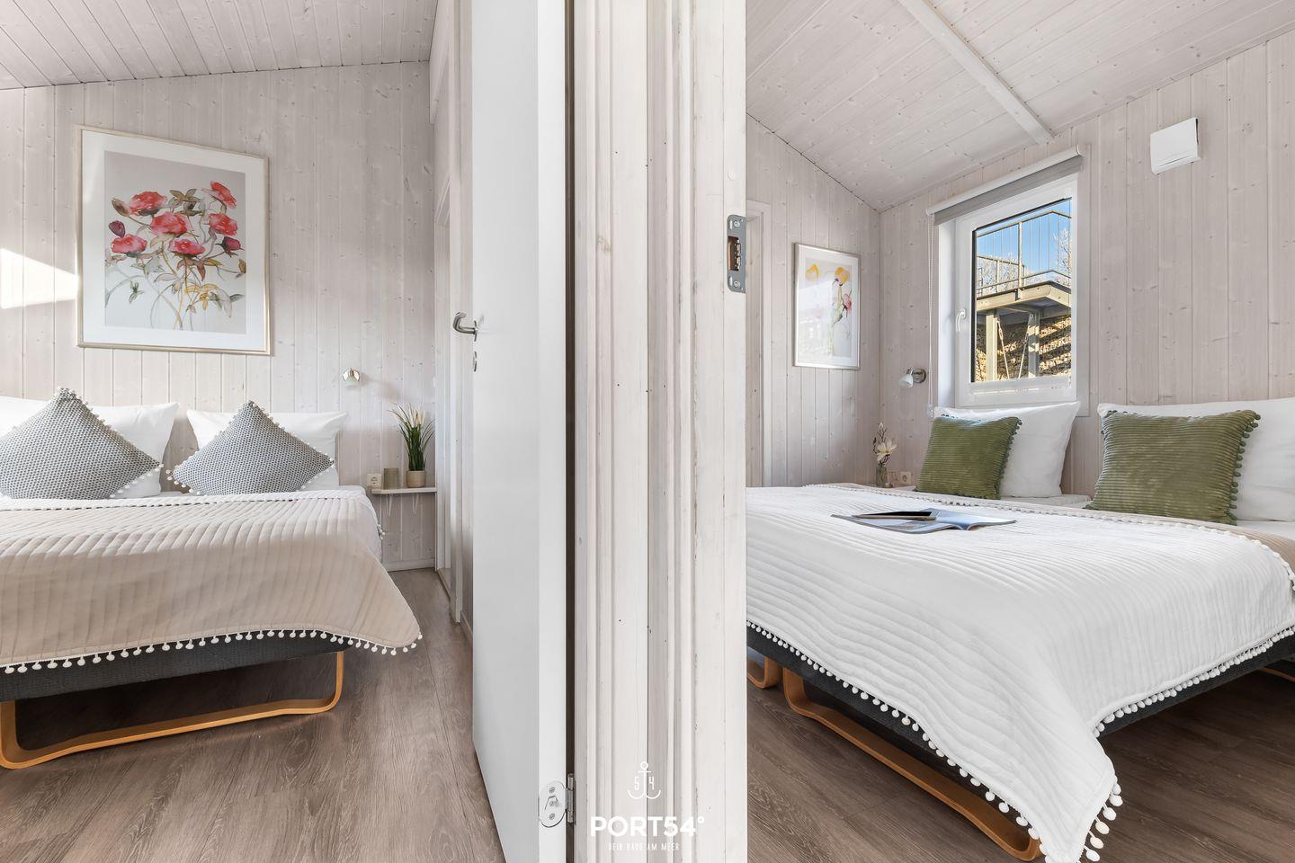 Das Ferienhaus verfügt über zwei Schlafzimmer, die jeweils mit zwei zusammengeschobenen Einzelbetten (zusammen 160 x 200 cm) ausgestattet sind. Die ruhige und naturnahe Farbgestaltung schafft eine angenehme, entspannte Atmosphäre für erholsame Nächte. Im Wohnzimmer findest du eine ausziehbare Schlafcouch (140 x 190 cm), die Platz für zwei weitere Personen bietet – ideal für Kinder oder Freunde. Bettwäsche und Handtücher können optional hinzugebucht werden.