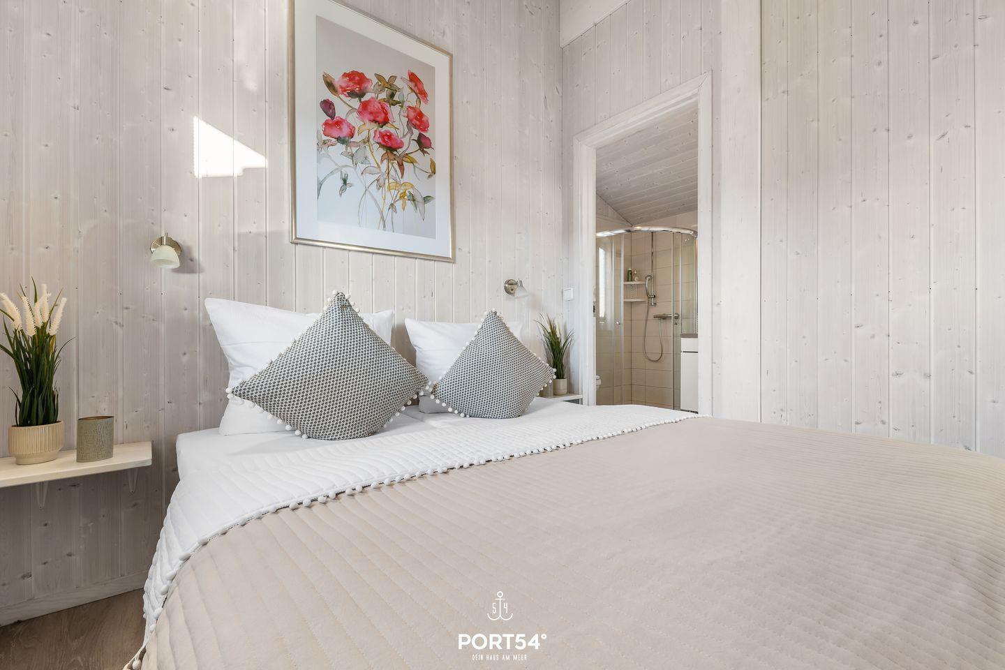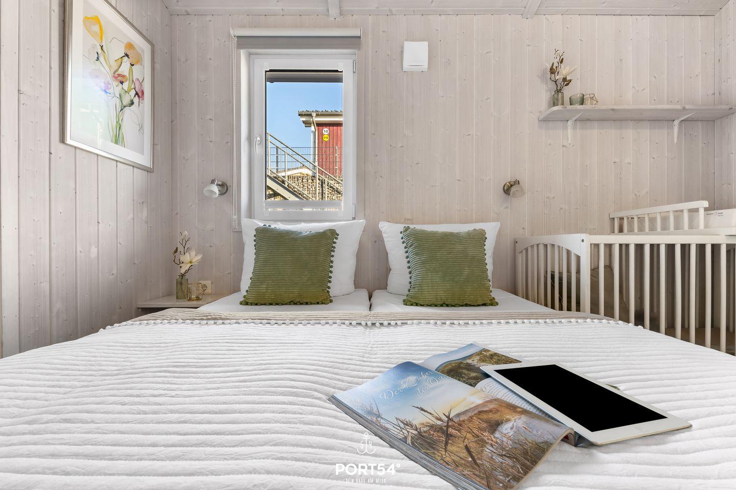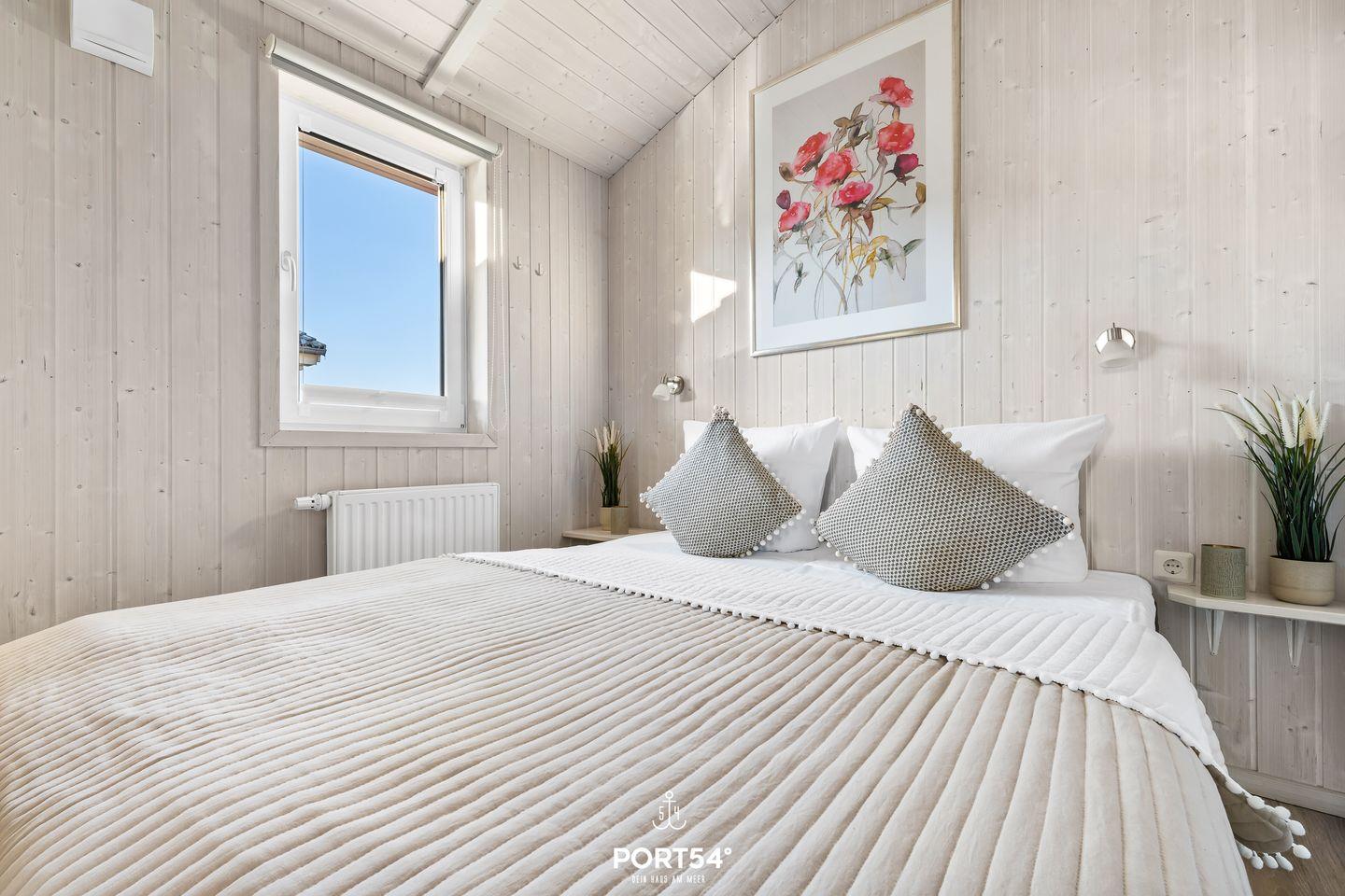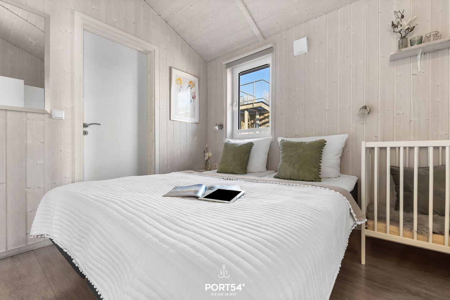 Das Ferienhaus verfügt über zwei Schlafzimmer, die jeweils mit zwei zusammengeschobenen Einzelbetten (zusammen 160 x 200 cm) ausgestattet sind. Die ruhige und naturnahe Farbgestaltung schafft eine angenehme, entspannte Atmosphäre für erholsame Nächte. Im Wohnzimmer findest du eine ausziehbare Schlafcouch (140 x 190 cm), die Platz für zwei weitere Personen bietet – ideal für Kinder oder Freunde. Bettwäsche und Handtücher können optional hinzugebucht werden.