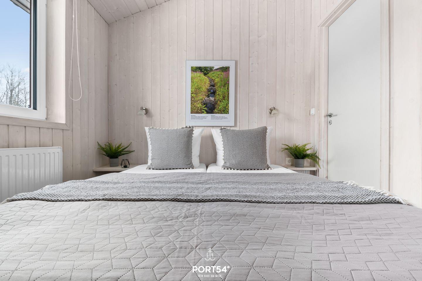 Das Ferienhaus verfügt über zwei Schlafzimmer, die jeweils mit zwei zusammengeschobenen Einzelbetten (zusammen 160 x 200 cm) ausgestattet sind. Die ruhige und naturnahe Farbgestaltung schafft eine angenehme, entspannte Atmosphäre für erholsame Nächte. Im Wohnzimmer findest du eine ausziehbare Schlafcouch (140 x 190 cm), die Platz für zwei weitere Personen bietet – ideal für Kinder oder Freunde. Bettwäsche und Handtücher können optional hinzugebucht werden.
