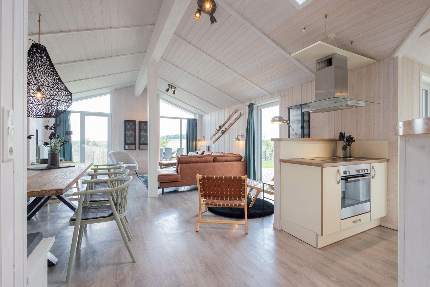 Der offene Wohnbereich bildet das Herzstück des Hauses. Eine gemütliche Couch, skandinavisches Desigt mit klaren Linien und ein Holzofenkamin sorgen für eine behagliche Atmosphäre, die zum Entspannen und Verweilen einlädt. Die großen Fenster bieten einen atemberaubenden Blick auf die umgebende Natur und lassen viel Tageslicht in den Raum. Zur Unterhaltung stehen insgesamt 4 TV-Geräte zur Verfügung, sodass für alle Gäste stets für Unterhaltung gesorgt ist.