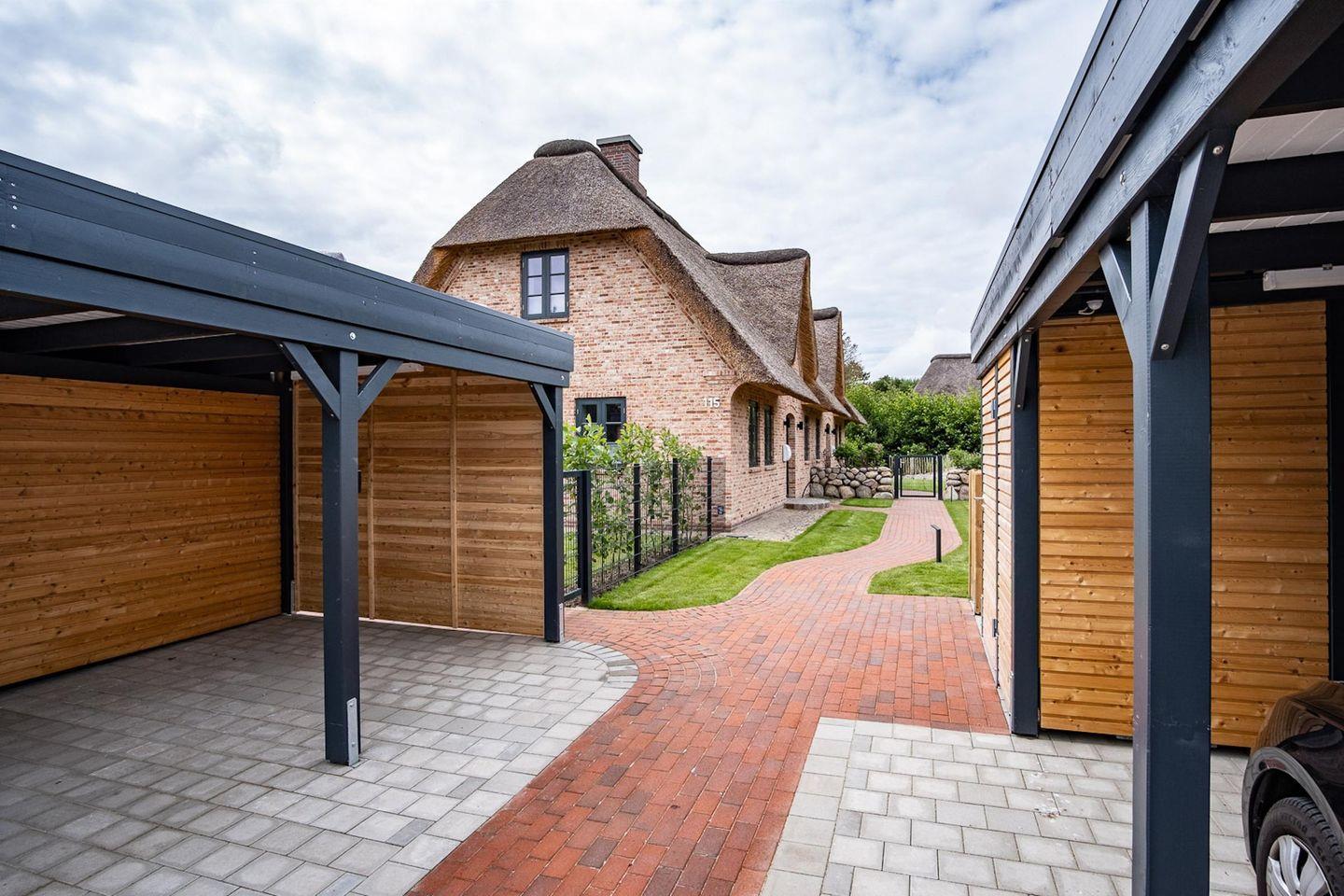 Das Grundstück mit Stellplatz, Carport, Rasenfläche und einer großzügigen geschützten, sonnigen Terrasse, inklusive edlen Gartenmöbeln ist mit heimischen Pflanzen und einem Friesenwall mit Dünengras angelegt.