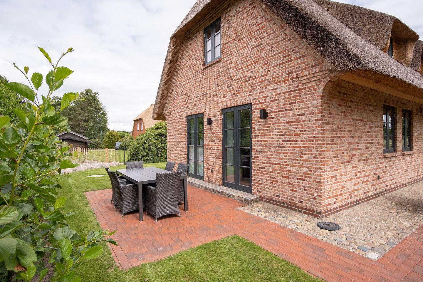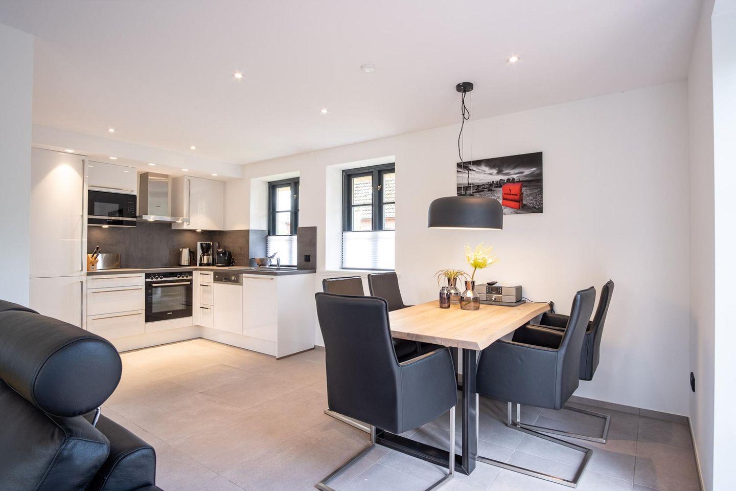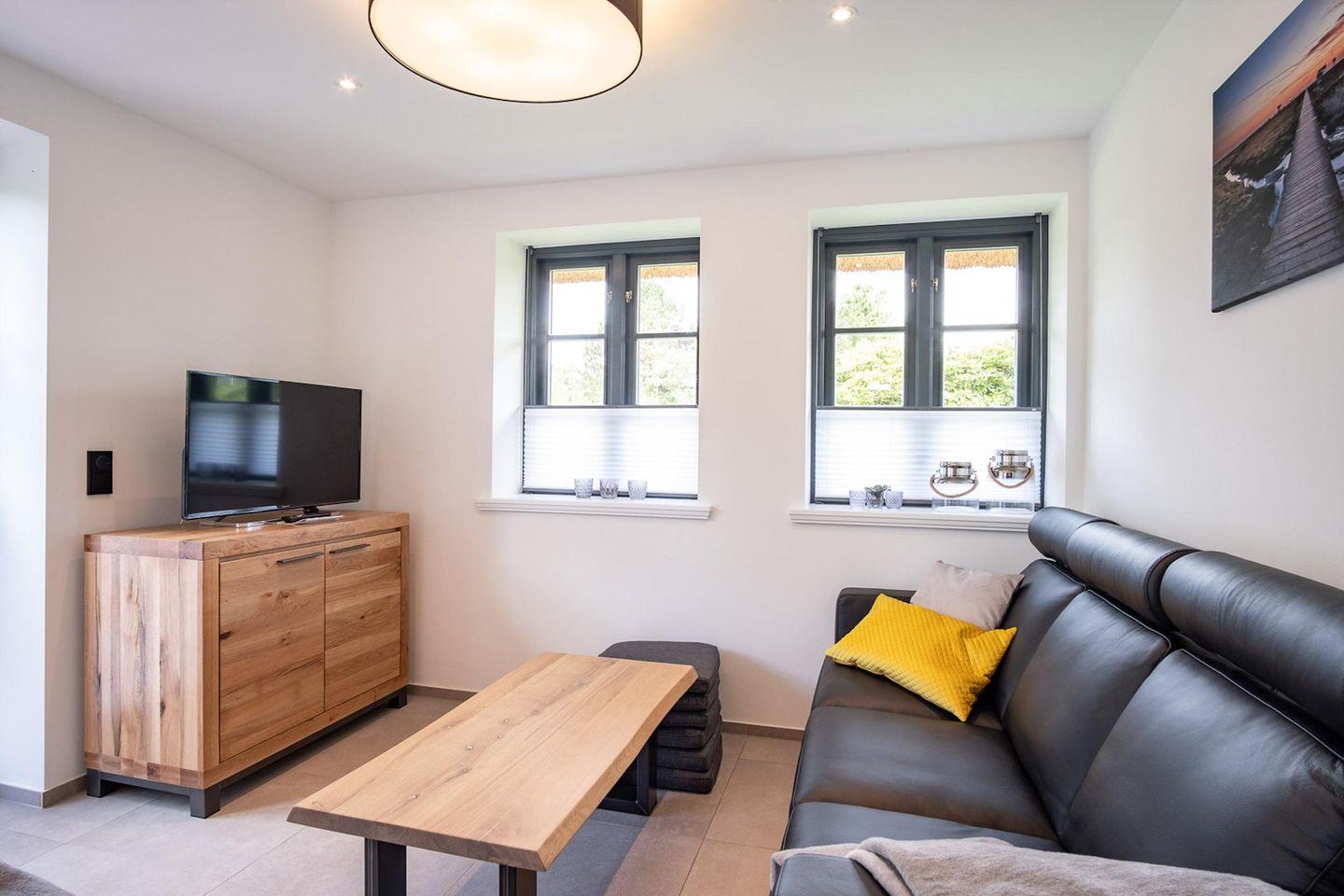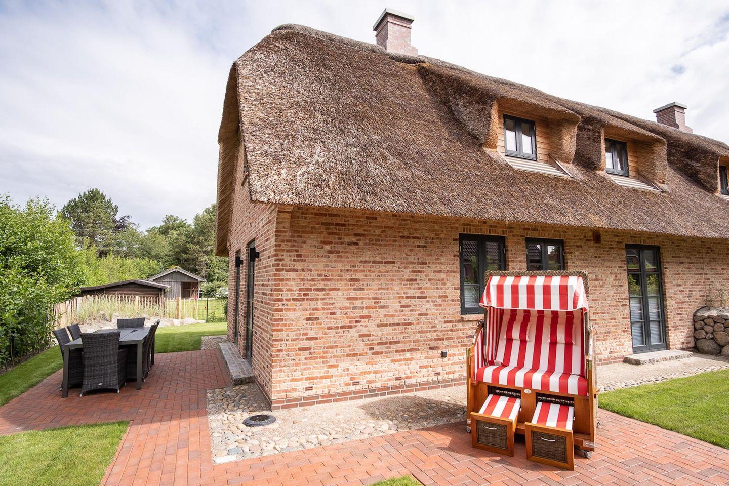 Die wunderschöne Haushälfte unter Reet verfügt über ca. 95 m² Wohnfläche und bietet Platz für 5 Personen. Im Erdgeschoss befindet sich der lichtdurchflutete Wohnraum mit TV, einer luxuriösen, angrenzenden Küche sowie einem stilvollen Essbereich. Der Wohnraum ist mit modernen, stylischen Möbeln eingerichtet. Die Küche verfügt über hochwertige Elektrogeräte und ist voll ausgestattet. An den Wohnbereich schließen sich ein Flur, ein Duschbad und ein Doppelschlafzimmer mit TV an.