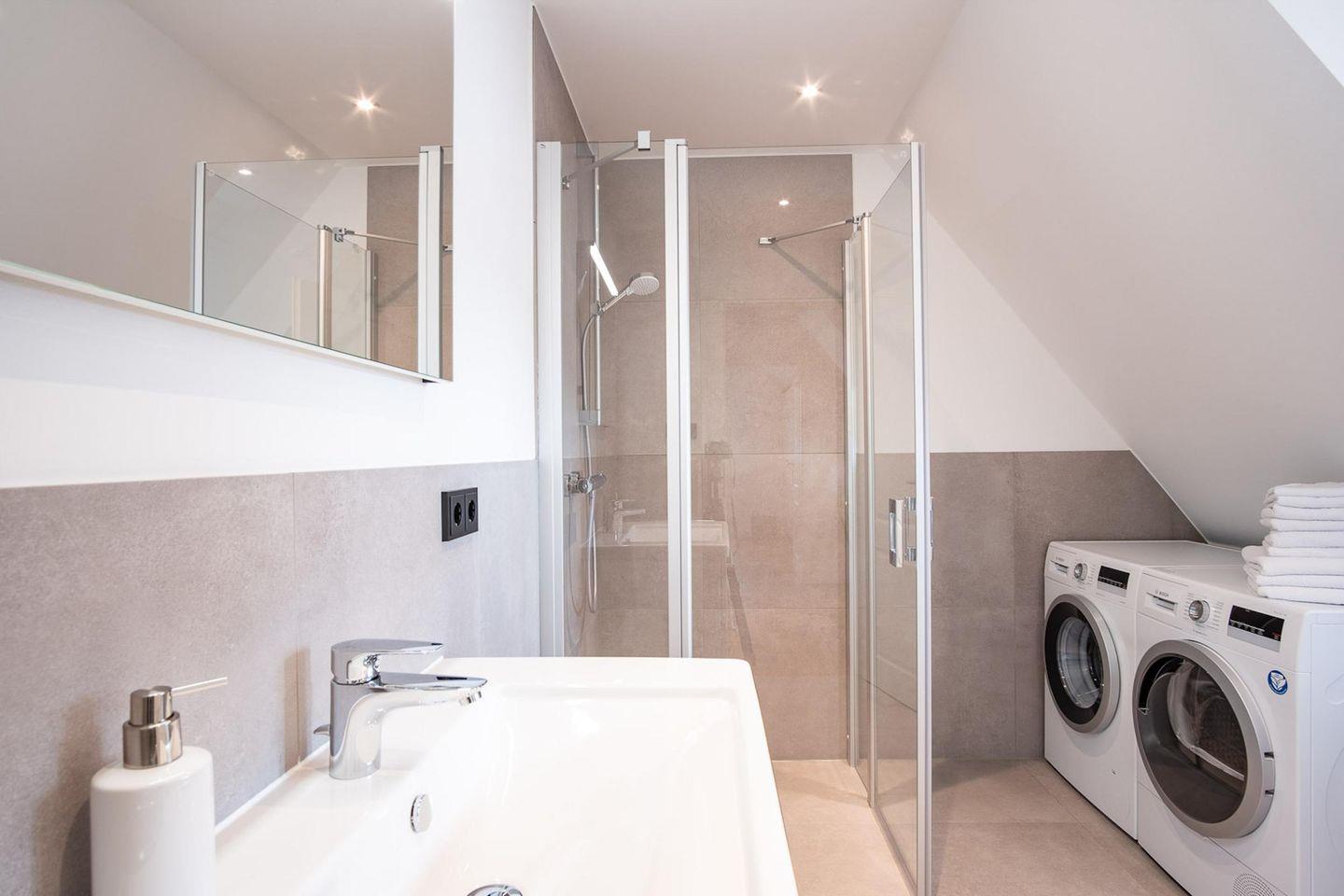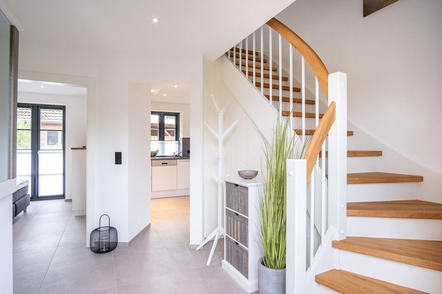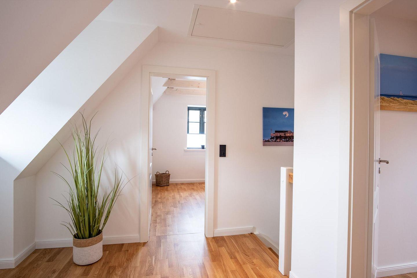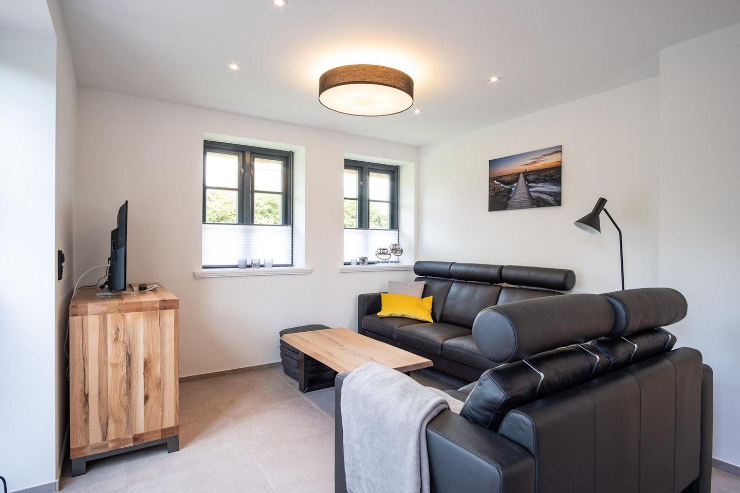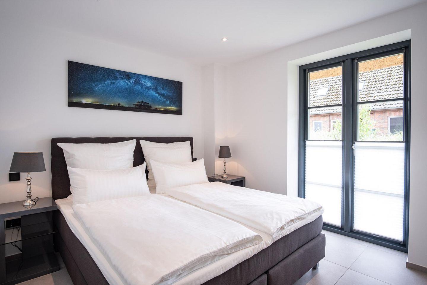 Die wunderschöne Haushälfte unter Reet verfügt über ca. 95 m² Wohnfläche und bietet Platz für 5 Personen. Im Erdgeschoss befindet sich der lichtdurchflutete Wohnraum mit TV, einer luxuriösen, angrenzenden Küche sowie einem stilvollen Essbereich. Der Wohnraum ist mit modernen, stylischen Möbeln eingerichtet. Die Küche verfügt über hochwertige Elektrogeräte und ist voll ausgestattet. An den Wohnbereich schließen sich ein Flur, ein Duschbad und ein Doppelschlafzimmer mit TV an.