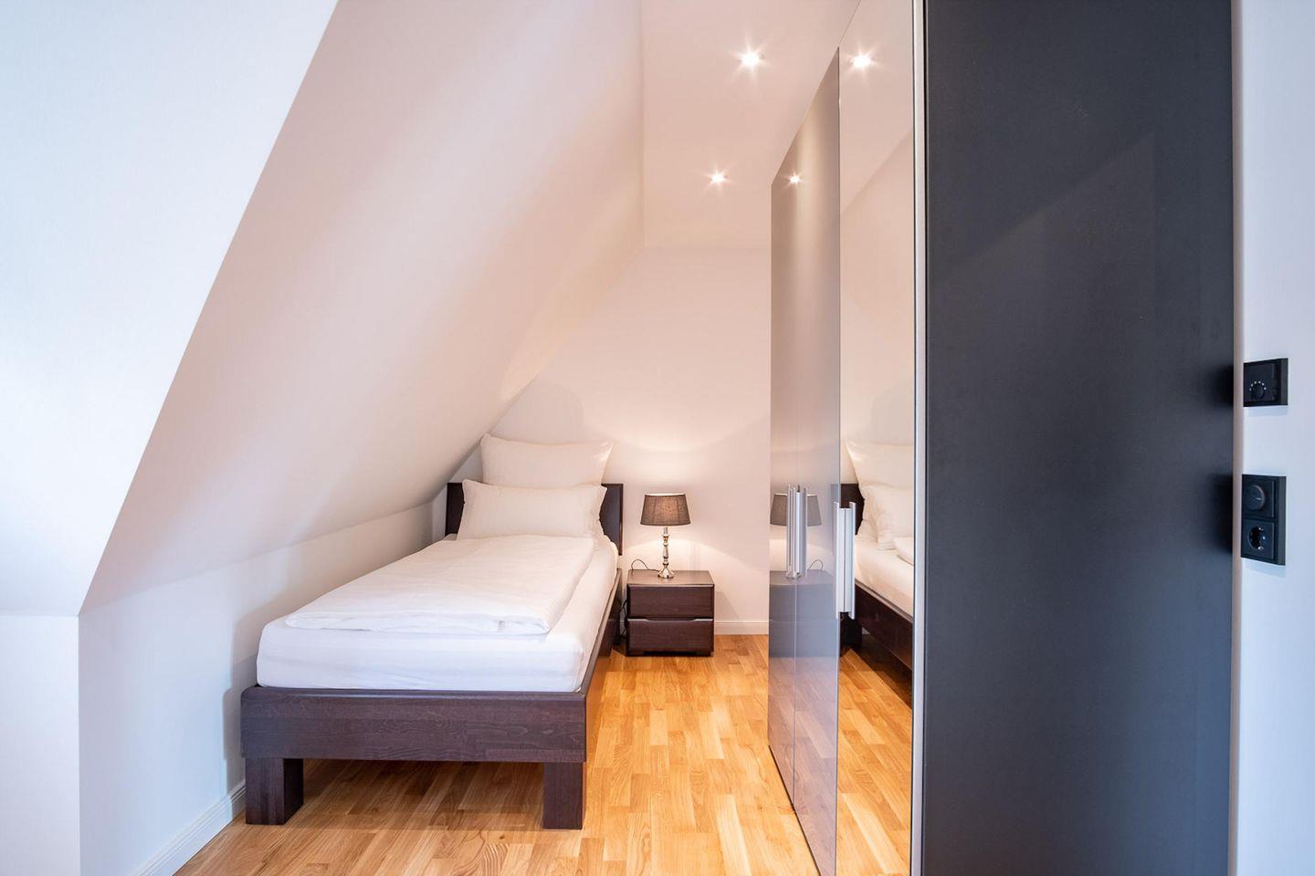 Über eine Holztreppe gelangt man in das Obergeschoss. Die beiden Schlafzimmer, eines mit Doppelbett und TV und das andere mit 1 Einzelbett, bieten ruhevolle Erholung.