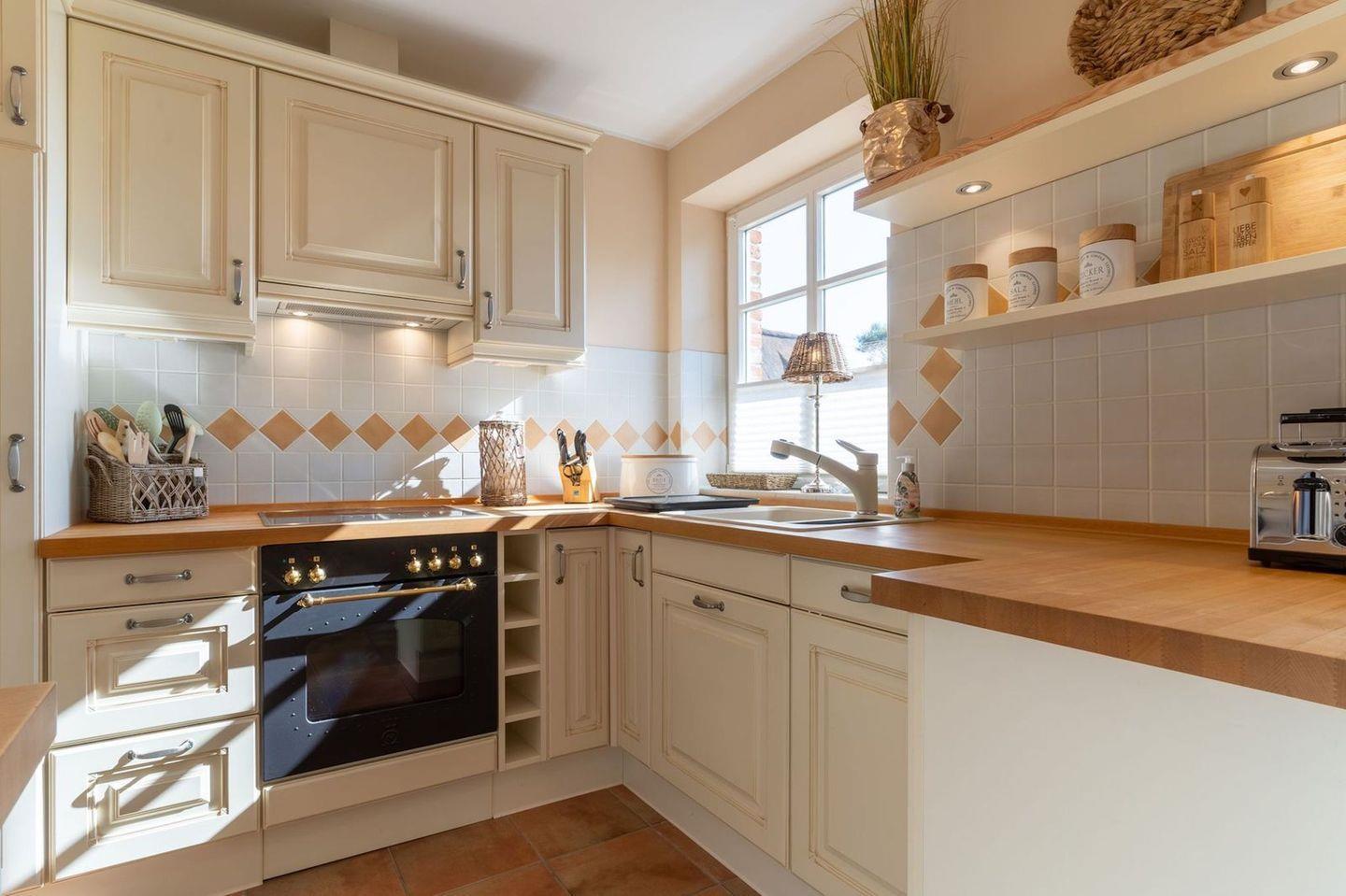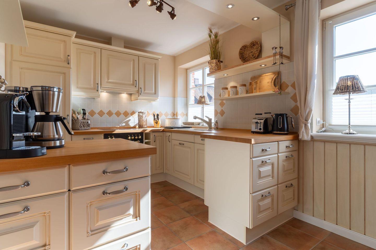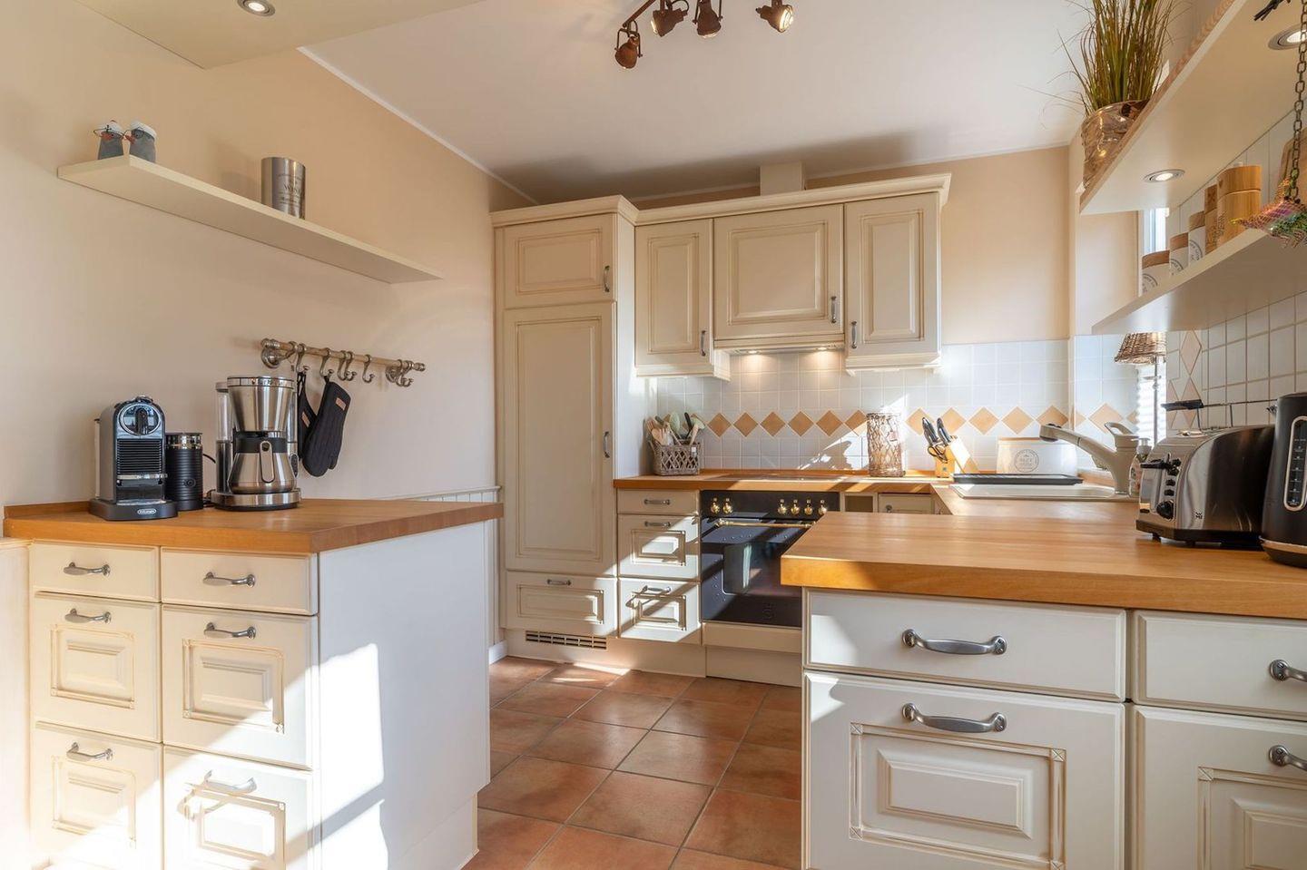 Die Küche ist voll ausgestattet mit hochwertigen Geräten. An den Wohnbereich schließen sich Flur, Hauswirtschaftsraum und ein Gäste WC an.