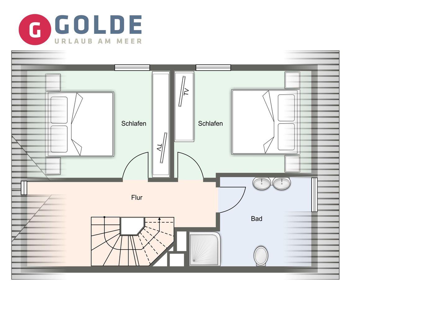 Über eine Holztreppe gelangt man in das Obergeschoss. Die beiden Schlafzimmer, jeweils mit einem Doppelbett und TV sorgen für ruhevolle Erholung. Einbauschränke gewähren Ihnen hinreichend Ablageflächen.