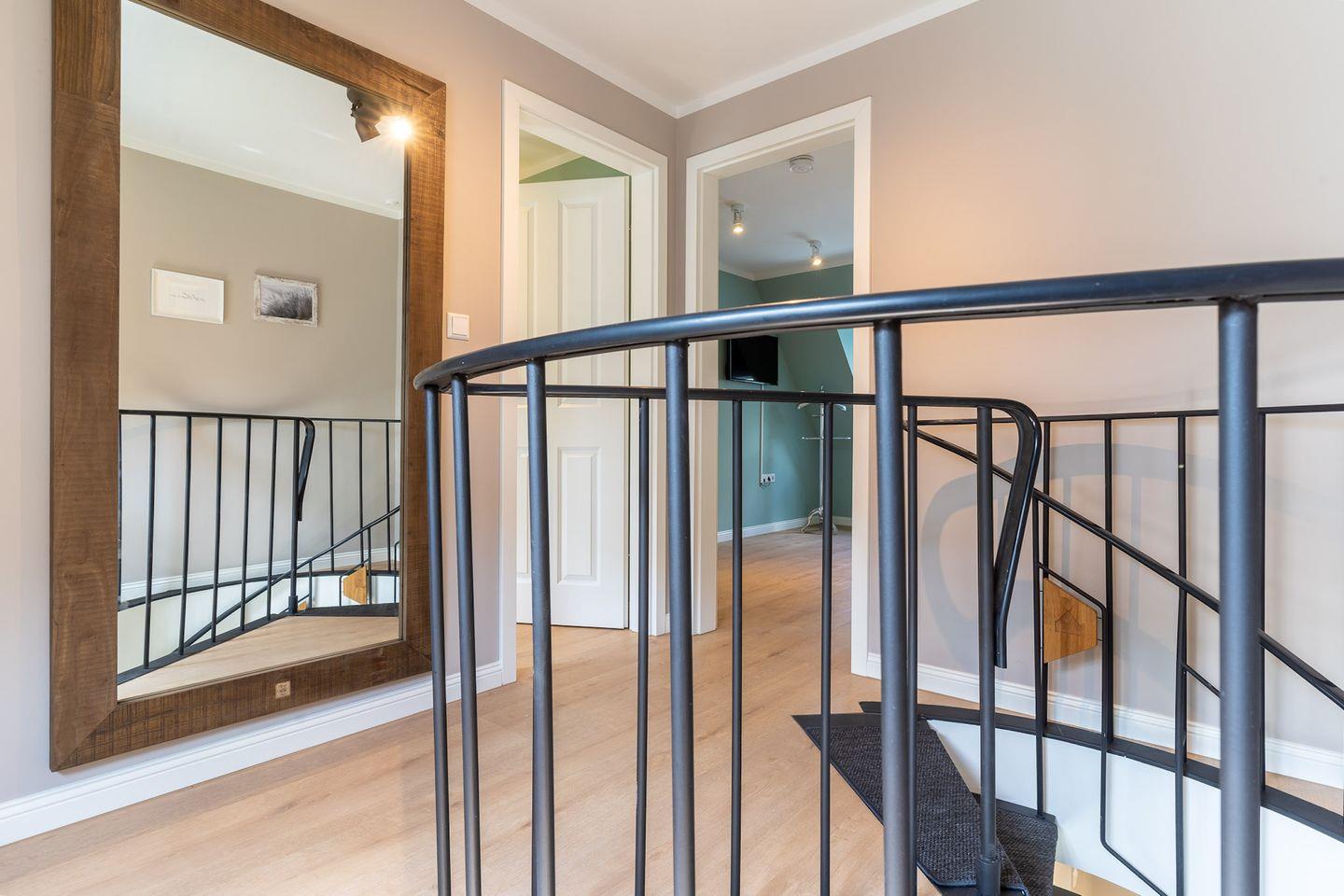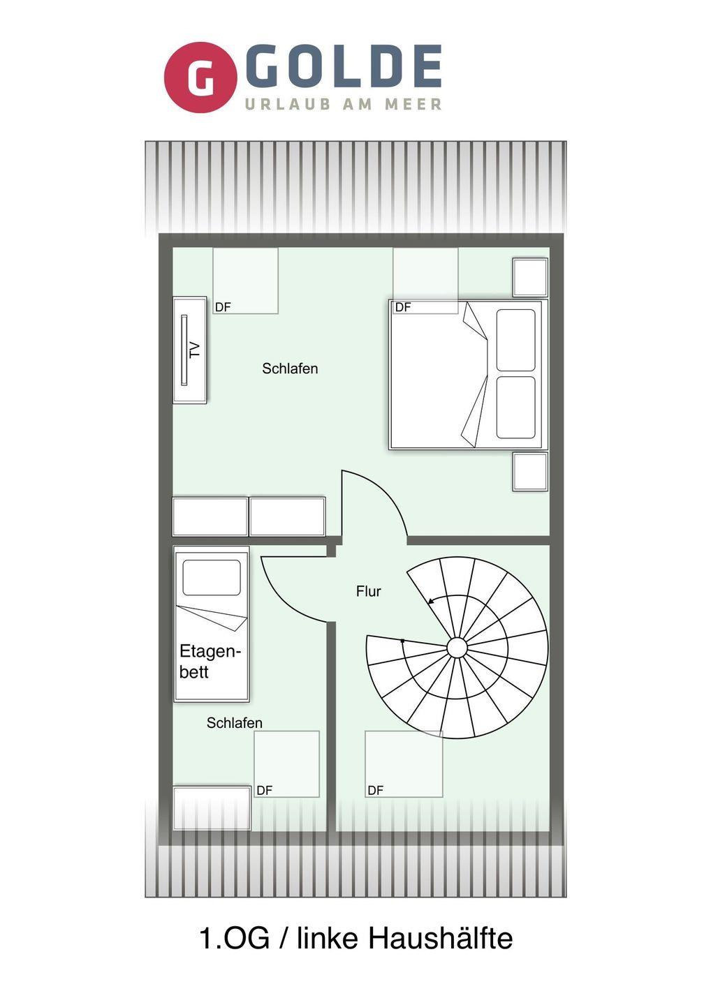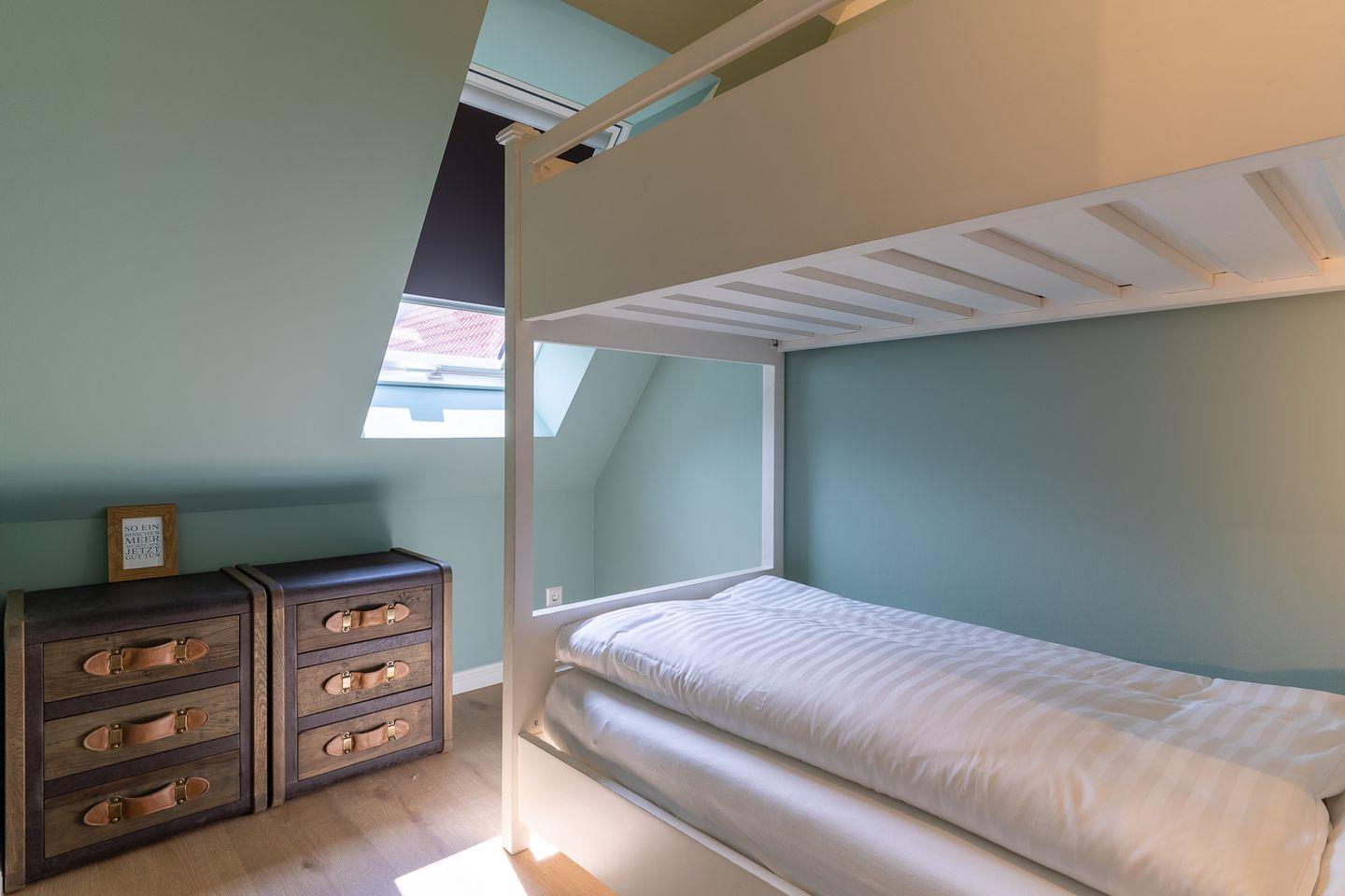 Über eine Wendeltreppe aus dem Wohnraum gelangt man in das Obergeschoss. Hier befinden sich zwei gemütliche Schlafzimmer, eines mit einem Doppelbett und eines mit einem Etagenbett.